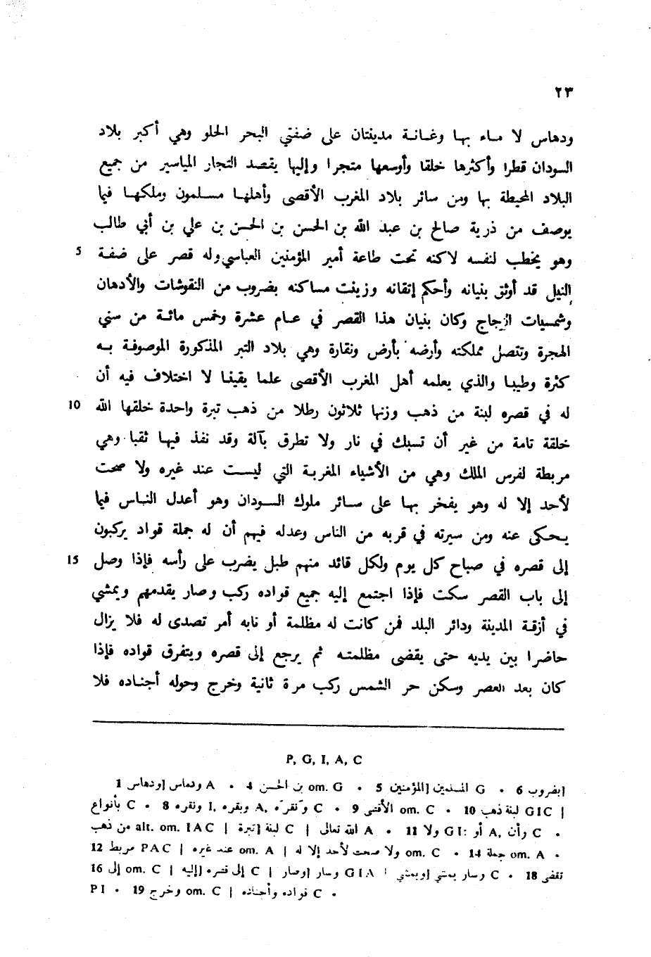 ودهاس لا ماء بها وغانة مدينتان على ضفتي البحر الحلو وهي أكبر بلاد السودان قطرا وأكثرها خلقا وأوسعها متجرا وإليها يقصد التجار المياسير من جميع البلاد المحيطة بها ومن سائر بلاد المغرب الأقصى وأهلها مسلمون وملكها فيما يوصف من ذرية صالح بن عبد الله بن الحسن بن الحسن بن علي بن أبي طالب وهو يخطب لنفسه لاكنه تحت طاعة أمير المؤمنين العباسي وله قصر على ضفة النيل قد أوثق بنيانه وأحكم إتقانه وزينت مساكنه بضروب من النقوشات والأدهان وشمسيات الزجاج وكان بنيان هذا القصر في عام عشرة وخمس مائة من سني الهجرة وتتصل مملكته وأرضه بأرض ونقارة وهي بلاد التبر المذكورة الموصوفة به كثرة وطيبا والذي يعلمه أهل المغرب الأقصى علما يقينا لا اختلاف فيه أن له في قصره لبنة من ذهب وزنها ثلاثون رطلا من ذهب تبرة واحدة خلقها الله خلقة تامة من غير أن تسبك في نار ولا تطرق بآلة وقد نفذ فيها ثقبا وهي مربطة لفرس الملك وهي من الأشياء المغربة التي ليست عند غيره ولا صحت لأحد إلا له وهو يفخر بها على سائر ملوك السودان وهو أعدل الناس فيما يحكى عنه ومن سيرته في قربه من الناس وعدله فيهم أن له جملة قواد يركبون إلى قصره في صباح كل يوم ولكل قائد منهم طبل يضرب على رأسه فإذا وصل إلى باب القصر سكت فإذا اجتمع إليه جميع قواده ركب وصار يقدمهم ويمشي في أزقة المدينة ودائر البلد فمن كانت له مظلمة أو نابه أمر تصدى له فلا يزال حاضرا بين يديه حتى يقضى مظلمته ثم يرجع إلى قصره ويتفرق قواده فإذا كان بعد العصر وسكن حر الشمس ركب مرة ثانية وخرج وحوله أجناده فلا
