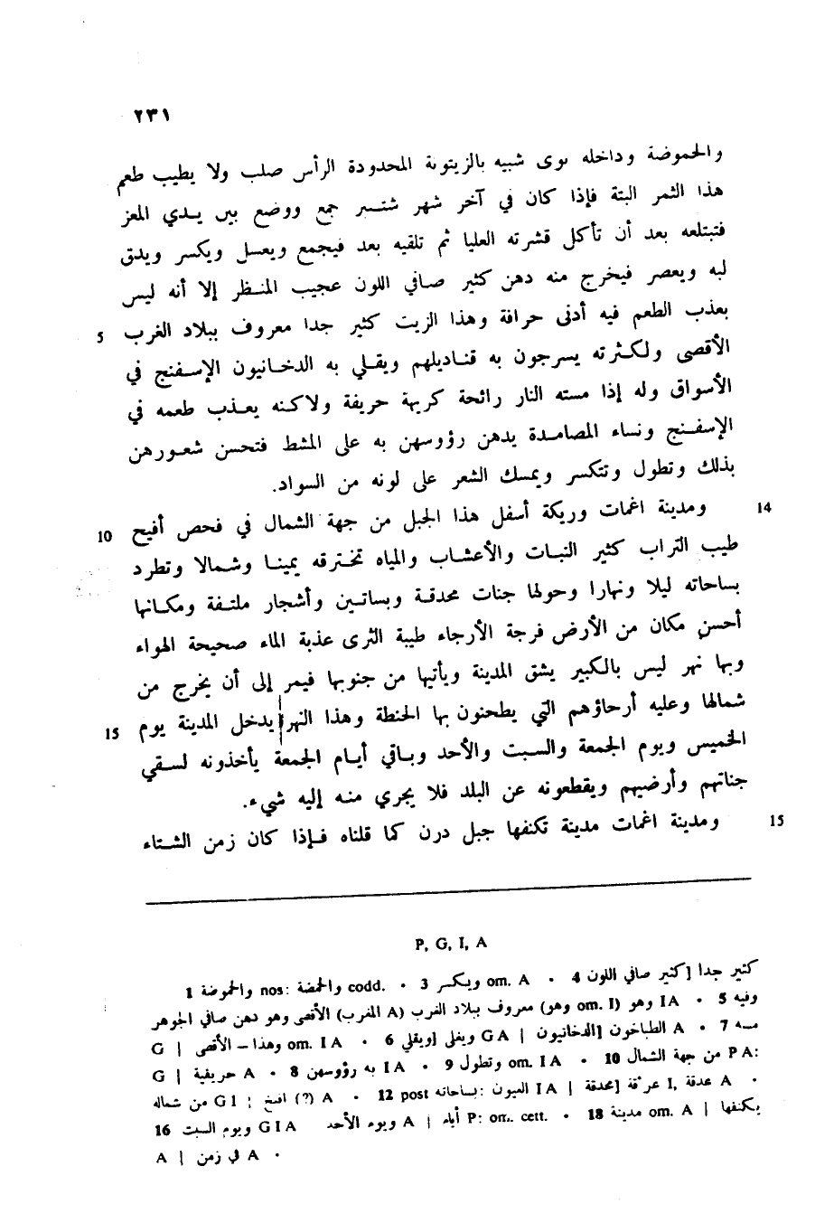 والحموضة وداخله نوى شبيه بالزيتونة المحدودة الرأس صلب ولا يطيب طعم هذا الثمر البتة فإذا كان في آخر شهر شتنبر جمع ووضع بين يدي المعز فتبتلعه بعد أن تأكل قشرته العليا ثم تلقيه بعد فيجمع ويغسل ويكسر ويدق لبه ويعصر فيخرج منه دهن كثير صافي اللون عجيب المنظر إلا أنه ليس بعذب الطعم فيه أدنى حرافة وهذا الزيت كثير جدا معروف ببلاد الغرب الأقصى ولكثرته يسرجون به قناديلهم ويقلي به الدخانيون الإسفنج في الأسواق وله إذا مسته النار رائحة كريهة حريفة ولاكنه يعذب طعمه في الإسفنج ونساء المصامدة يدهن رؤوسهن به على المشط فتحسن شعورهن بذلك وتطول وتتكسر ويمسك الشعر على لونه من السواد.