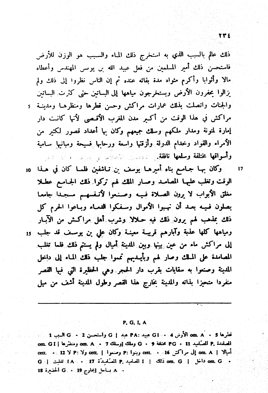 ذلك عالم بالسبب الذي به استخرج ذلك الماء والسبب هو الوزن للأرض فاستحسن ذلك أمير المسلمين من فعل عبيد الله بن يونس المهندس وأعطاه مالا وأثوابا وأكرم مثواه مدة بقائه عنده ثم إن الناس نظروا إلى ذلك ولم يزالوا يحفرون الأرض ويستخرجون مياهها إلى البساتين حتى كثرت البساتين والجنات واتصلت بذلك عمارات مراكش وحسن قطرها ومنظرها ومدينة مراكش في هذا الوقت من أكبر مدن المغرب الأقصى لأنها كانت دار إمارة لمتونة ومدار ملكهم وسلك جميعهم وكان بها أعداد قصور لكثير من الأمراء والقواد وخدام الدولة وأزقتها واسعة ورحابها فسيحة ومبانيها سامية وأسواقها مختلفة وسلعها نافقة.