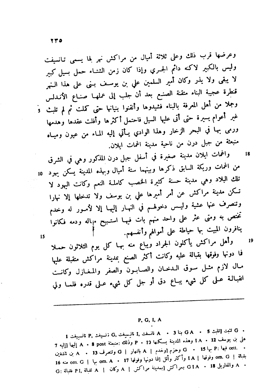 وعرضها قرب ذلك وعلى ثلاثة أميال من مراكش نهر لها يسمى تانسيفت وليس بالكبير لاكنه دائم الجري وإذا كان زمن الشتاء حمل بسيل كبير لا يبقى ولا يذر وكان أمير المسلمين علي بن يوسف بنى على هذا النهر قنطرة عجيبة البناء متقنة الصنع بعد أن جلب إلى عملها صناع الأندلس وجملا من أهل المعرفة بالبناء فشيدوها وأتقنوا بنيانها حتى كملت ثم لم تلبث غير أعوام يسيرة حتى أتى عليها السيل فاحتمل أكثرها وأفلت عقدها وهدمها ورمى بها في البحر الزخار وهذا الوادي يأتي إليه الماء من عيون ومياه منبعثة من جبل درن من ناحية مدينة اغمات ايلان.
