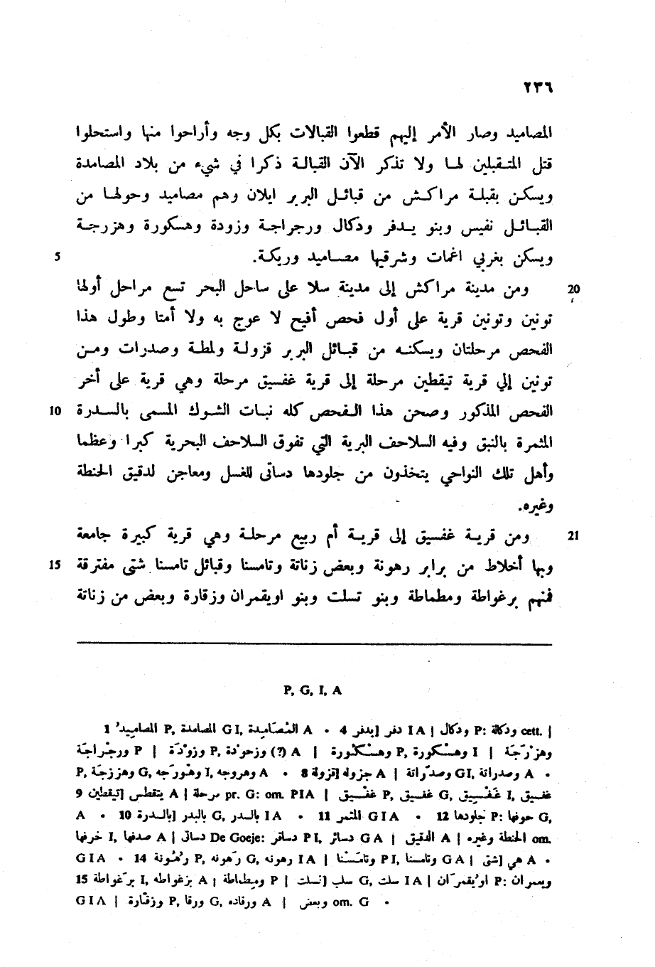 ومن مدينة مراكش إلى مدينة سلا على ساحل البحر تسع مراحل أولها تونين وتونين قرية على أول فحص أفيح لا عوج به ولا أمتا وطول هذا الفحص مرحلتان ويسكنه من قبائل البربر قزولة ولمطة وصدرات ومن تونين إلي قرية تيقطين مرحلة إلى قرية غفسيق مرحلة وهي قرية على أخر الفحص المذكور وصحن هذا الفحص كله نبات الشوك المسمى بالسدرة المثمرة بالنبق وفيه السلاحف البرية التي تفوق السلاحف البحرية كبرا وعظما وأهل تلك النواحي يتخذون من جلودها دساتى للغسل ومعاجن لدقيق الحنطة وغيره.