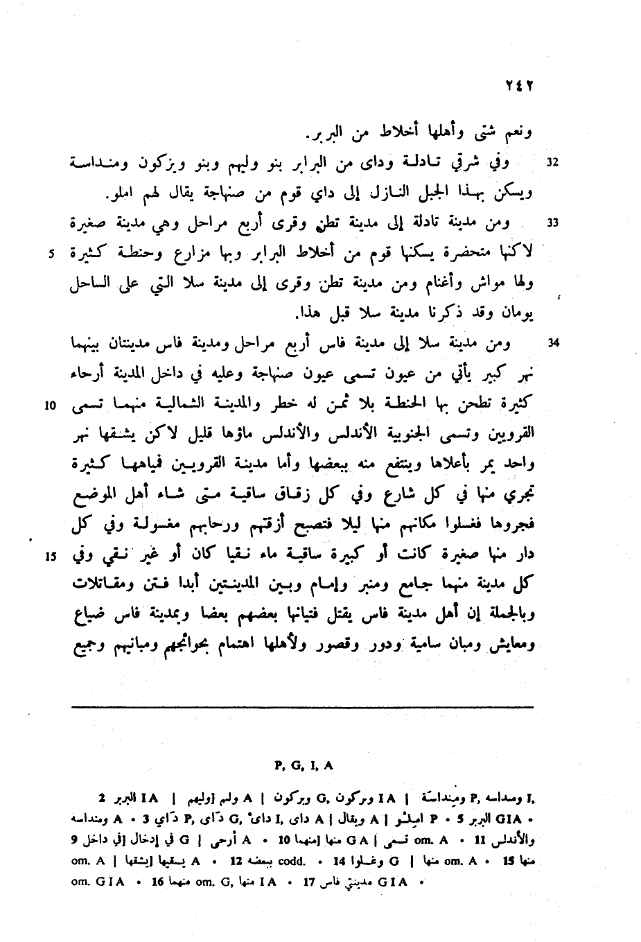 ومن مدينة سلا إلى مدينة فاس أربع مراحل ومدينة فاس مدينتان بينهما نهر كبير يأتي من عيون تسمى عيون صنهاجة وعليه في داخل المدينة أرحاء كثيرة تطحن بها الحنطة بلا ثمن له خطر والمدينة الشمالية منهما تسمى القرويين وتسمى الجنوبية الأندلس والأندلس ماؤها قليل لاكن يشقها نهر واحد يمر بأعلاها وينتفع منه ببعضها وأما مدينة القرويين فمياهها كثيرة تجري منها في كل شارع وفي كل زقاق ساقية متى شاء أهل الموضع فجروها فغسلوا مكانهم منها ليلا فتصبح أزقتهم ورحابهم مغسولة وفي كل دار منها صغيرة كانت أو كبيرة ساقية ماء نقيا كان أو غير نقي وفي كل مدينة منهما جامع ومنبر وإمام وبين المدينتين أبدا فتن ومقاتلات وبالجملة إن أهل مدينة فاس يقتل فتيانها بعضهم بعضا وبمدينة فاس ضياع ومعايش ومبان سامية ودور وقصور ولأهلها اهتمام بحوائجهم ومبانيهم وجميع