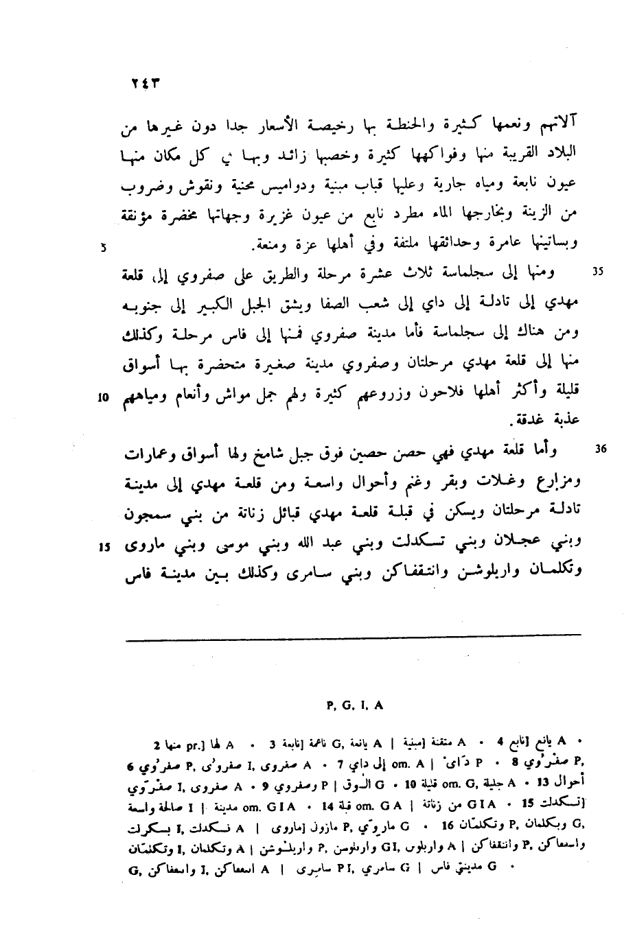 ومنها إلى سجلماسة ثلاث عشرة مرحلة والطريق على صفروي إلى قلعة مهدي إلى تادلة إلى داي إلى شعب الصفا ويشق الجبل الكبير إلى جنوبه ومن هناك إلى سجلماسة فأما مدينة صفروي فمنها إلى فاس مرحلة وكذلك منها إلى قلعة مهدي مرحلتان وصفروي مدينة صغيرة متحضرة بها أسواق قليلة وأكثر أهلها فلاحون وزروعهم كثيرة ولهم جمل مواش وأنعام ومياههم عذبة غدقة.