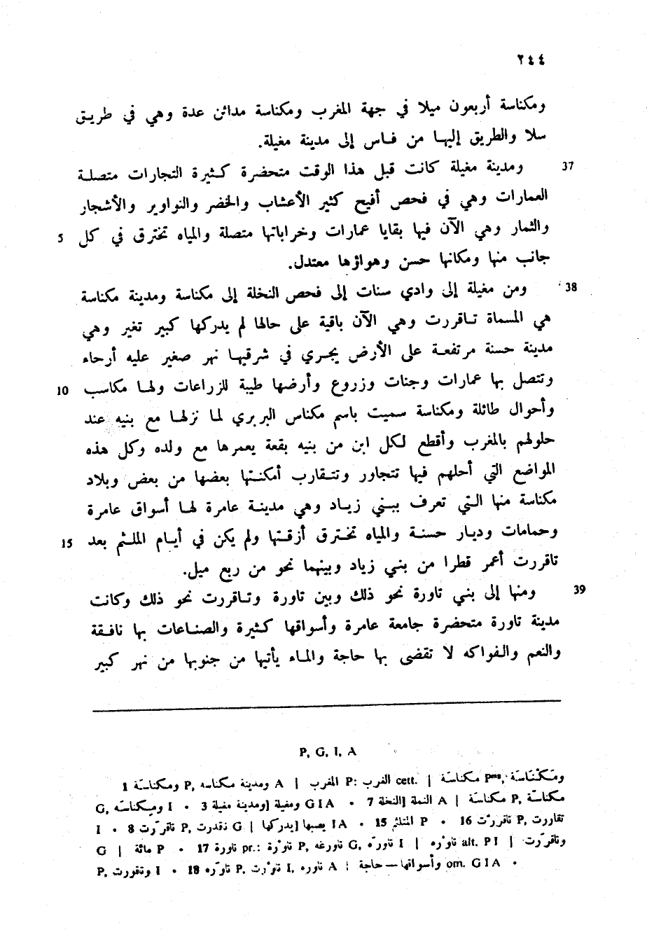 ومنها إلى بني تاورة نحو ذلك وبين تاورة وتاقررت نحو ذلك وكانت مدينة تاورة متحضرة جامعة عامرة وأسواقها كثيرة والصناعات بها نافقة والنعم والفواكه لا تقضى بها حاجة والماء يأتيها من جنوبها من نهر كبير