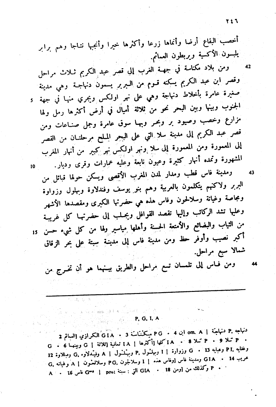 ومدينة فاس قطب ومدار لمدن المغرب الأقصى ويسكن حولها قبائل من البربر ولاكنهم يتكلمون بالعربية وهم بنو يوسف وفندلاوة وبهلول وزواوة ومجاصة وغياتة وسلالحون وفاس هذه هي حضرتها الكبرى ومقصدها الأشهر وعليها تشد الركائب وإليها تقصد القوافل ويجلب إلى حضرتها كل غريبة من الثياب والبضائع والأمتعة الحسنة وأهلها مياسير ولها من كل شيء حسن أكبر نصيب وأوفر حظ ومن مدينة فاس إلى مدينة سبتة على بحر الزقاق شمالا سبع مراحل.