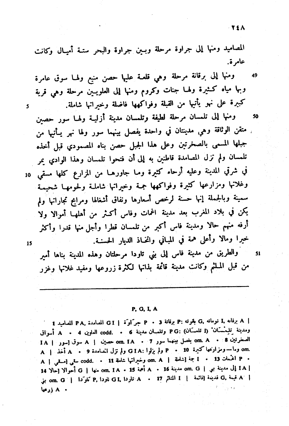 ومنها إلى تلمسان مرحلة لطيفة وتلمسان مدينة أزلية ولها سور حصين متقن الوثاقة وهي مدينتان في واحدة يفصل بينهما سور ولها نهر يأتيها من جبلها المسمى بالصخرتين وعلى هذا الجبل حصن بناه المصمودي قبل أخذه تلمسان ولم تزل المصامدة قاطنين به إلى أن فتحوا تلمسان وهذا الوادي يمر في شرقي المدينة وعليه أرحاء كثيرة وما جاورها من المزارع كلها مسقي وغلاتها ومزارعها كثيرة وفواكهها جمة وخيراتها شاملة ولحومها شحيمة سمينة وبالجملة إنها حسنة لرخص أسعارها ونفاق أشغالها ومرابح تجاراتها ولم يكن في بلاد المغرب بعد مدينة اغمات وفاس أكثر من أهلها أموالا ولا أرفه منهم حالا ومدينة فاس أكبر من تلمسان قطرا وأجل منها قدرا وأكثر خيرا ومالا وأعلى همة في المباني واتخاذ الديار الحسنة.