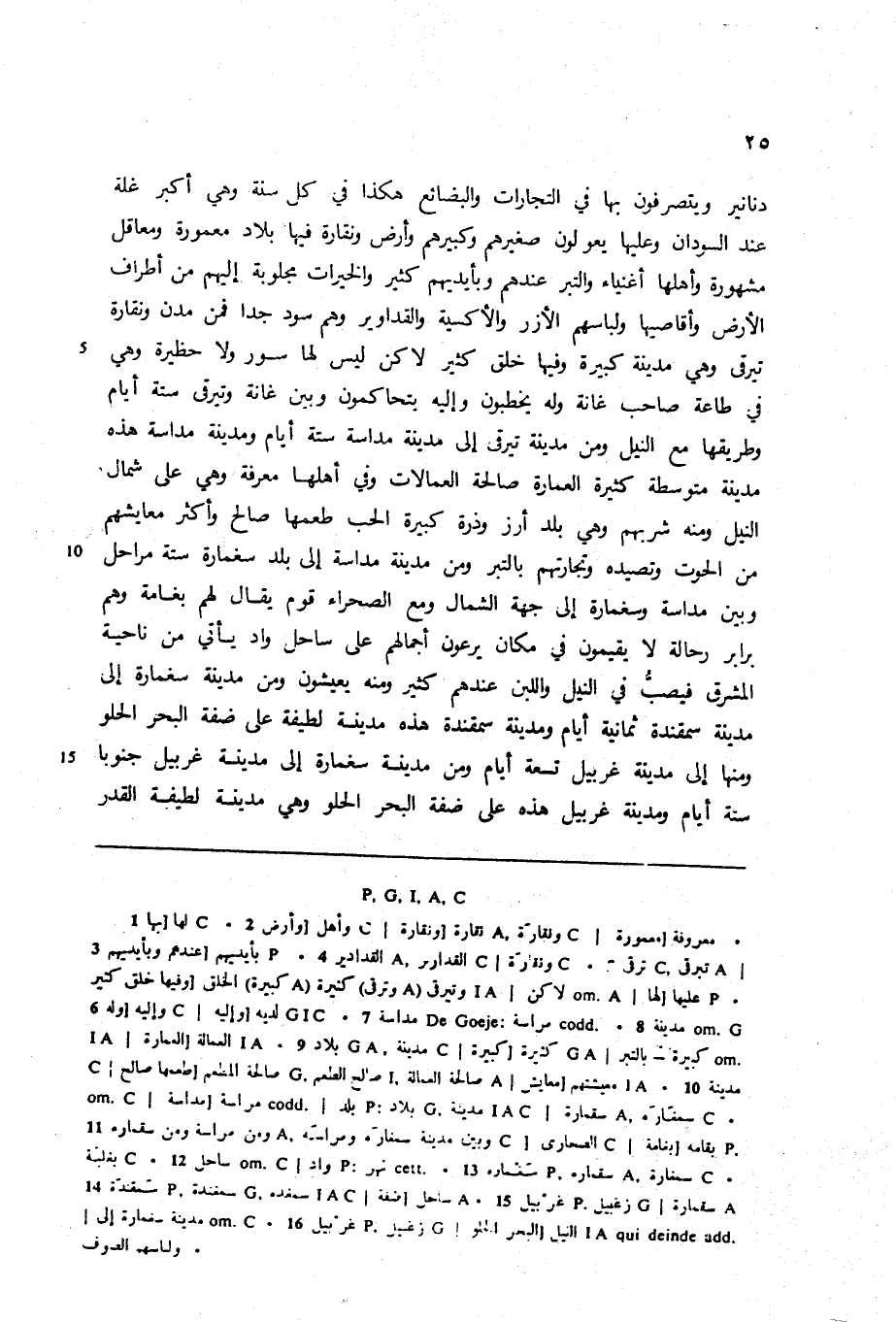دنانير ويتصرفون بها في التجارات والبضائع هكذا في كل سنة وهي أكبر غلة عند السودان وعليها يعولون صغيرهم وكبيرهم وأرض ونقارة فيها بلاد معمورة ومعاقل مشهورة وأهلها أغنياء والتبر عندهم وبأيديهم كثير والخيرات مجلوبة إليهم من أطراف الأرض وأقاصيها ولباسهم الأزر والأكسية والقداوير وهم سود جدا فمن مدن ونقارة تيرقى وهي مدينة كبيرة وفيها خلق كثير لاكن ليس لها سور ولا حظيرة وهي في طاعة صاحب غانة وله يخطبون وإليه يتحاكمون وبين غانة وتيرقى ستة أيام وطريقها مع النيل ومن مدينة تيرقى إلى مدينة مداسة ستة أيام ومدينة مداسة هذه مدينة متوسطة كثيرة العمارة صالحة العمالات وفي أهلها معرفة وهي على شمال النيل ومنه شربهم وهي بلد أرز وذرة كبيرة الحب طعمها صالح وأكثر معايشهم من الحوت وتصيده وتجارتهم بالتبر ومن مدينة مداسة إلى بلد سغمارة ستة مراحل وبين مداسة وسغمارة إلى جهة الشمال ومع الصحراء قوم يقال لهم بغامة وهم برابر رحالة لا يقيمون في مكان يرعون أجمالهم على ساحل واد يأتي من ناحية المشرق فيصبّ في النيل واللبن عندهم كثير ومنه يعيشون ومن مدينة سغمارة إلى مدينة سمقندة ثمانية أيام ومدينة سمقندة هذه مدينة لطيفة على ضفة البحر الحلو ومنها إلى مدينة غربيل تسعة أيام ومن مدينة سغمارة إلى مدينة غربيل جنوبا ستة أيام ومدينة غربيل هذه على ضفة البحر الحلو وهي مدينة لطيفة القدر