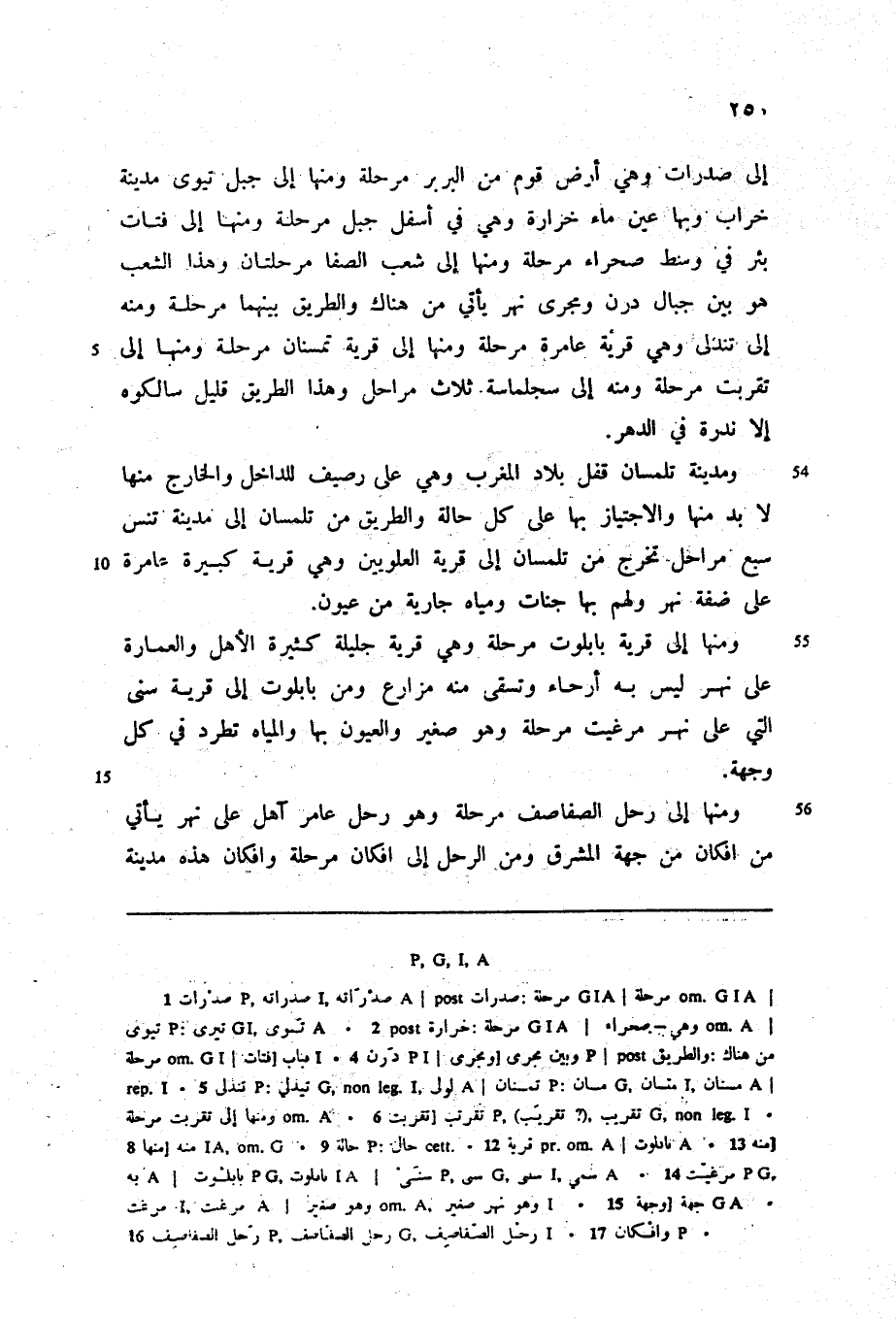 ومدينة تلمسان قفل بلاد المغرب وهي على رصيف للداخل والخارج منها لا بد منها والاجتياز بها على كل حالة والطريق من تلمسان إلى مدينة تنس سبع مراحل تخرج من تلمسان إلى قرية العلويين وهي قرية كبيرة عامرة على ضفة نهر ولهم بها جنات ومياه جارية من عيون.