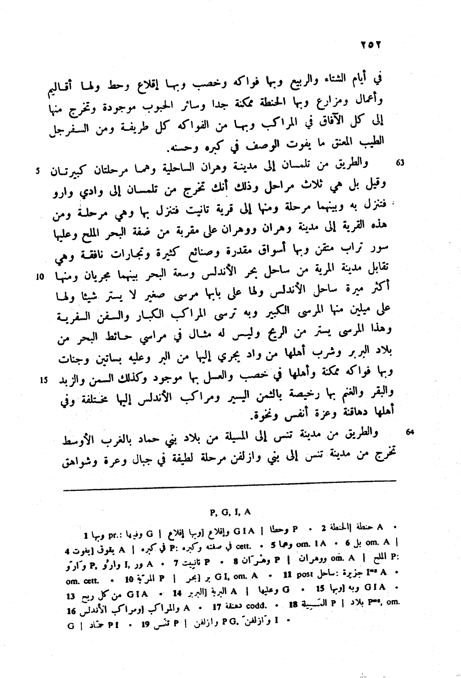 والطريق من تلمسان إلى مدينة وهران الساحلية وهما مرحلتان كبيرتان وقيل بل هي ثلاث مراحل وذلك أنك تخرج من تلمسان إلى وادي وارو فتنزل به وبينهما مرحلة ومنها إلى قرية تانيت فتنزل بها وهي مرحلة ومن هذه القرية إلى مدينة وهران ووهران على مقربة من ضفة البحر الملح وعليها سور تراب متقن وبها أسواق مقدرة وصنائع كثيرة وتجارات نافقة وهي تقابل مدينة المرية من ساحل بحر الأندلس وسعة البحر بينهما مجريان ومنها أكثر ميرة ساحل الأندلس ولها على بابها مرسى صغير لا يستر شيئا ولها على ميلين منها المرسى الكبير وبه ترسى المراكب الكبار والسفن السفرية وهذا المرسى يستر من الريح وليس له مثال في مراسي حائط البحر من بلاد البربر وشرب أهلها من واد يجري إليها من البر وعليه بساتين وجنات وبها فواكه ممكنة وأهلها في خصب والعسل بها موجود وكذلك السمن والزبد والبقر والغنم بها رخيصة بالثمن اليسير ومراكب الأندلس إليها مختلفة وفي أهلها دهاقنة وعزة أنفس ونخوة.
