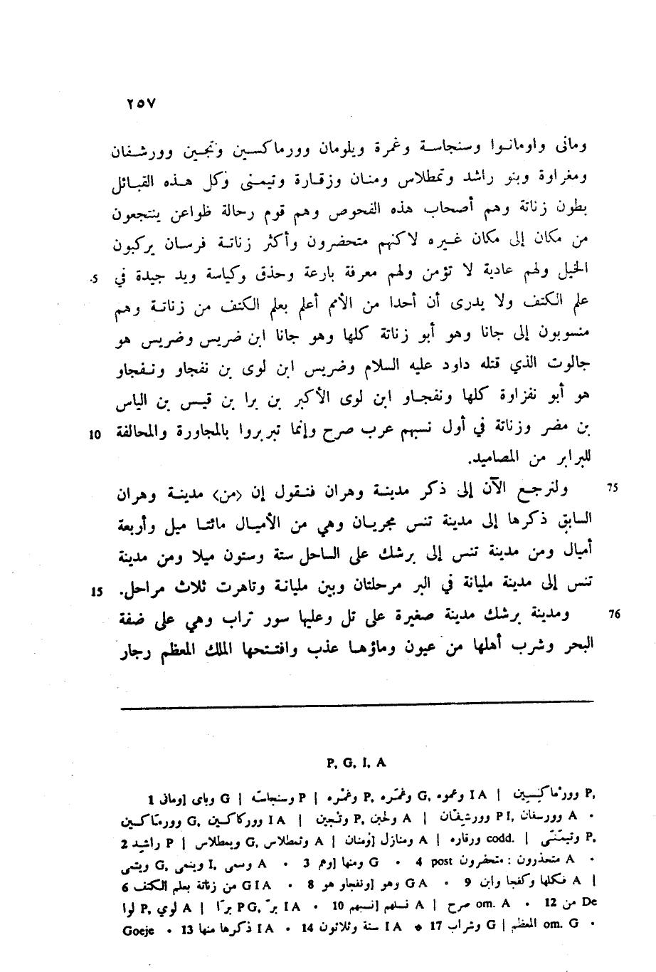 ومانى واومانوا وسنجاسة وغمرة ويلومان وورماكسين وتجين وورشفان ومغراوة وبنو راشد وتمطلاس ومنان وزقارة وتيمنى وكل هذه القبائل بطون زناتة وهم أصحاب هذه الفحوص وهم قوم رحالة ظواعن ينتجعون من مكان إلى مكان غيره لاكنهم متحضرون وأكثر زناتة فرسان يركبون الخيل ولهم عادية لا تؤمن ولهم معرفة بارعة وحذق وكياسة ويد جيدة في علم الكتف ولا يدرى أن أحدا من الأمم أعلم بعلم الكتف من زناتة وهم منسوبون إلى جانا وهو أبو زناتة كلها وهو جانا ابن ضريس وضريس هو جالوت الذي قتله داود عليه السلام وضريس ابن لوى بن نفجاو ونفجاو هو أبو نفزاوة كلها ونفجاو ابن لوى الأكبر بن برا بن قيس بن الياس بن مضر وزناتة في أول نسبهم عرب صرح وإنما تبربروا بالمجاورة والمحالفة للبرابر من المصاميد.