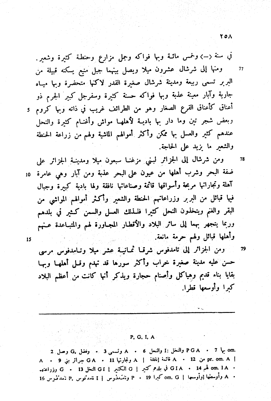 ومن شرشال إلى الجزائر لبني مزغنا سبعون ميلا ومدينة الجزائر على ضفة البحر وشرب أهلها من عيون على البحر عذبة ومن آبار وهي عامرة آهلة وتجاراتها مربحة وأسواقها قائمة وصناعاتها نافقة ولها بادية كبيرة وجبال فيها قبائل من البربر وزراعاتهم الحنطة والشعير وأكثر أموالهم المواشي من البقر والغنم ويتخذون النحل كثيرا فلذلك العسل والسمن كثير في بلدهم وربما يتجهز بهما إلى سائر البلاد والأقطار المجاورة لهم والمتباعدة عنهم وأهلها قبائل ولهم حرمة مانعة.