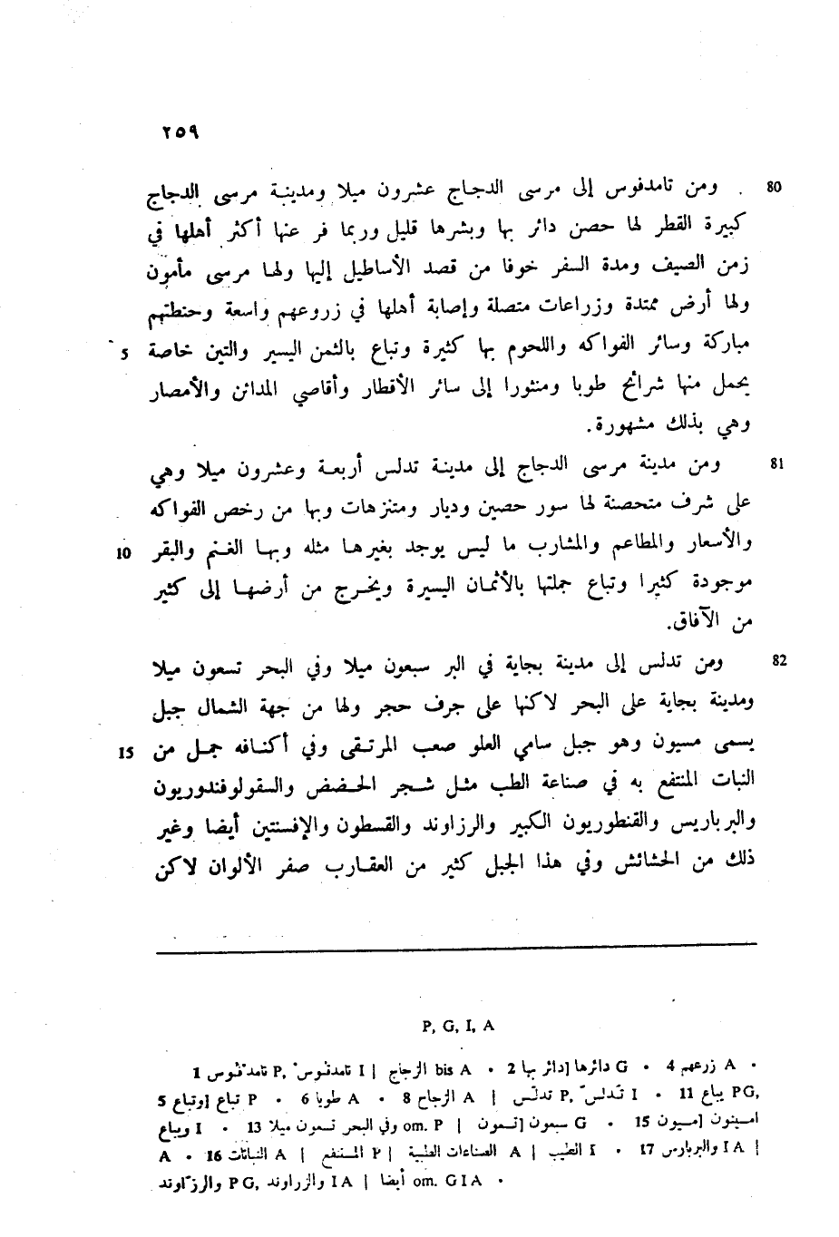 ومن تامدفوس إلى مرسى الدجاج عشرون ميلا ومدينة مرسى الدجاج كبيرة القطر لها حصن دائر بها وبشرها قليل وربما فر عنها أكثر أهلها في زمن الصيف ومدة السفر خوفا من قصد الأساطيل إليها ولها مرسى مأمون ولها أرض ممتدة وزراعات متصلة وإصابة أهلها في زروعهم واسعة وحنطتهم مباركة وسائر الفواكه واللحوم بها كثيرة وتباع بالثمن اليسير والتين خاصة يحمل منها شرائح طوبا ومنثورا إلى سائر الأقطار وأقاصي المدائن والأمصار وهي بذلك مشهورة.