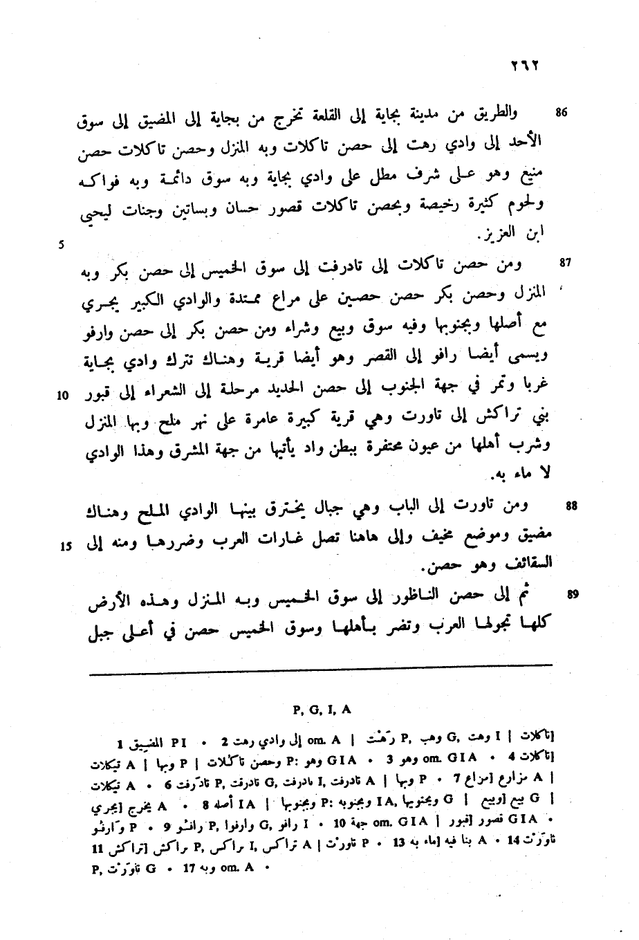 ومن حصن تاكلات إلى تادرفت إلى سوق الخميس إلى حصن بكر وبه المنزل وحصن بكر حصن حصين على مراع ممتدة والوادي الكبير يجري مع أصلها وبجنوبها وفيه سوق وبيع وشراء ومن حصن بكر إلى حصن وارفو ويسمى أيضا رافو إلى القصر وهو أيضا قرية وهناك تترك وادي بجاية غربا وتمر في جهة الجنوب إلى حصن الحديد مرحلة إلى الشعراء إلى قبور بني تراكش إلى تاورت وهي قرية كبيرة عامرة على نهر ملح وبها المنزل وشرب أهلها من عيون محتفرة ببطن واد يأتيها من جهة المشرق وهذا الوادي لا ماء به.