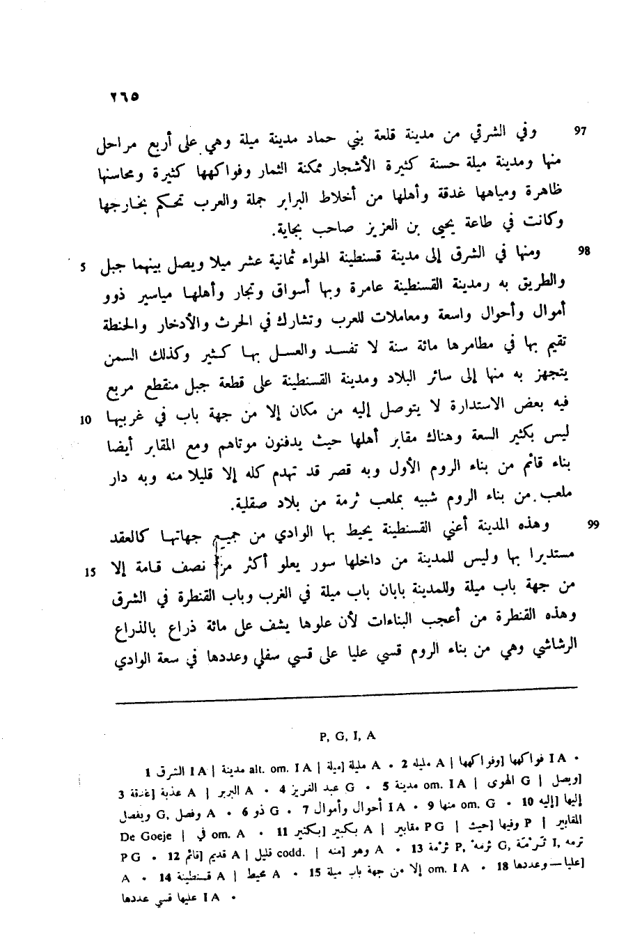 ومنها في الشرق إلى مدينة قسنطينة الهواء ثمانية عشر ميلا ويصل بينهما جبل والطريق به ومدينة القسنطينة عامرة وبها أسواق وتجار وأهلها مياسير ذوو أموال وأحوال واسعة ومعاملات للعرب وتشارك في الحرث والادخار والحنطة تقيم بها في مطامرها مائة سنة لا تفسد والعسل بها كثير وكذلك السمن يتجهز به منها إلى سائر البلاد ومدينة القسنطينة على قطعة جبل منقطع مربع فيه بعض الاستدارة لا يتوصل إليه من مكان إلا من جهة باب في غربيها ليس بكثير السعة وهناك مقابر أهلها حيث يدفنون موتاهم ومع المقابر أيضا بناء قائم من بناء الروم الأول وبه قصر قد تهدم كله إلا قليلا منه وبه دار ملعب من بناء الروم شبيه بملعب ثرمة من بلاد صقلية.