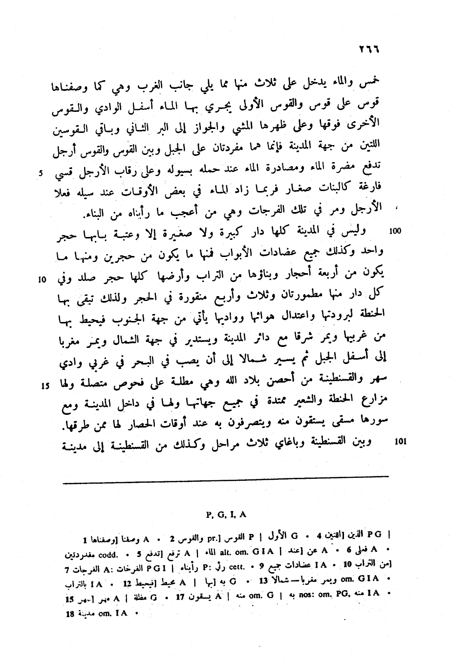 وليس في المدينة كلها دار كبيرة ولا صغيرة إلا وعتبة بابها حجر واحد وكذلك جميع عضادات الأبواب فمنها ما يكون من حجرين ومنها ما يكون من أربعة أحجار وبناؤها من التراب وأرضها كلها حجر صلد وفي كل دار منها مطمورتان وثلاث وأربع منقورة في الحجر ولذلك تبقى بها الحنطة لبرودتها واعتدال هوائها وواديها يأتي من جهة الجنوب فيحيط بها من غربيها ويمر شرقا مع دائر المدينة ويستدير في جهة الشمال ويمر مغربا إلى أسفل الجبل ثم يسير شمالا إلى أن يصب في البحر في غربي وادي سهر والقسنطينة من أحصن بلاد الله وهي مطلة على فحوص متصلة ولها مزارع الحنطة والشعير ممتدة في جميع جهاتها ولها في داخل المدينة ومع سورها مسقى يستقون منه ويتصرفون به عند أوقات الحصار لها ممن طرقها.