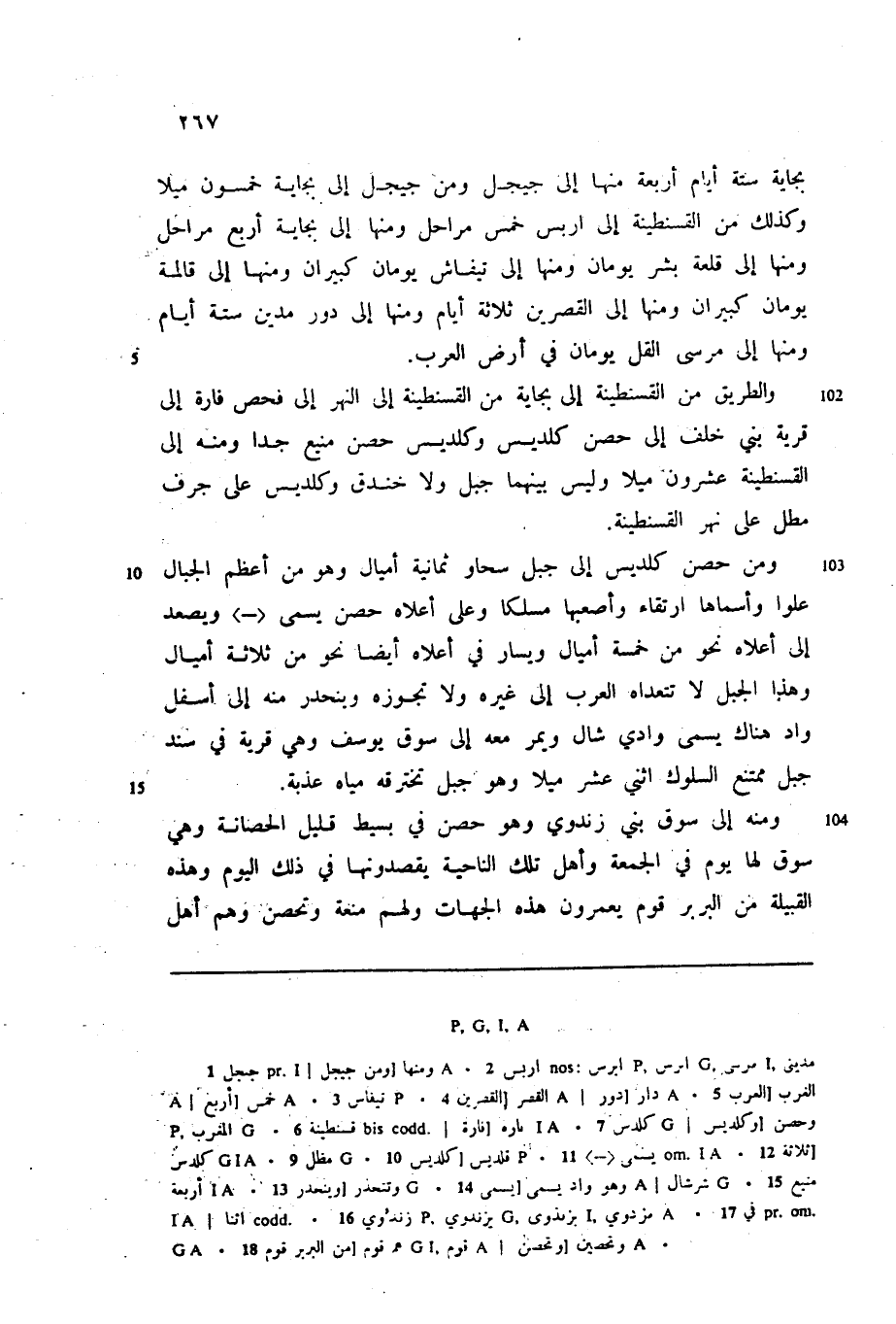 بجاية ستة أيام أربعة منها إلى جيجل ومن جيجل إلى بجاية خمسون ميلا وكذلك من القسنطينة إلى اربس خمس مراحل ومنها إلى بجاية أربع مراحل ومنها إلى قلعة بشر يومان ومنها إلى تيفاش يومان كبيران ومنها إلى قالمة يومان كبيران ومنها إلى القصرين ثلاثة أيام ومنها إلى دور مدين ستة أيام ومنها إلى مرسى القل يومان في أرض العرب.