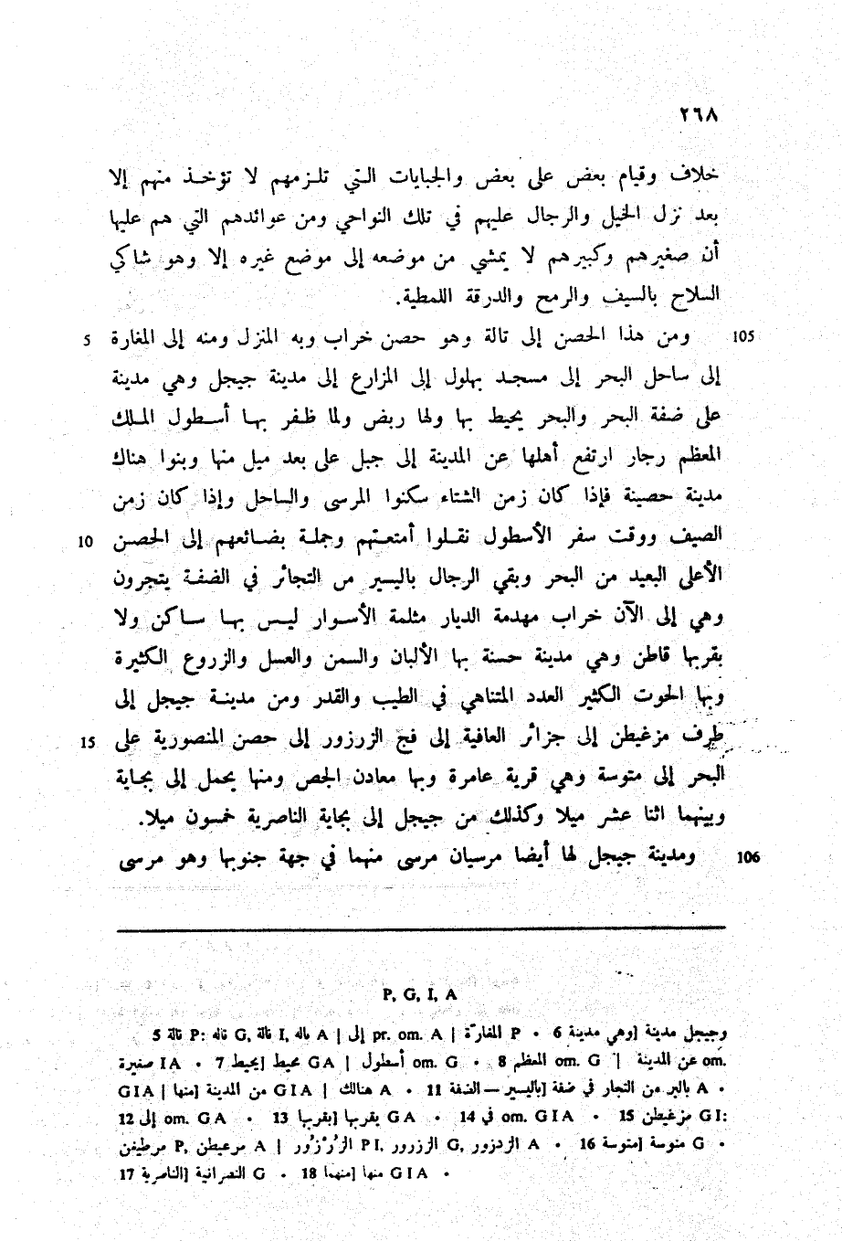 ومن هذا الحصن إلى تالة وهو حصن خراب وبه المنزل ومنه إلى المغارة إلى ساحل البحر إلى مسجد بهلول إلى المزارع إلى مدينة جيجل وهي مدينة على ضفة البحر والبحر يحيط بها ولها ربض ولما ظفر بها أسطول الملك المعظم رجار ارتفع أهلها عن المدينة إلى جبل على بعد ميل منها وبنوا هناك مدينة حصينة فإذا كان زمن الشتاء سكنوا المرسى والساحل وإذا كان زمن الصيف ووقت سفر الأسطول نقلوا أمتعتهم وجملة بضائعهم إلى الحصن الأعلى البعيد من البحر وبقي الرجال باليسير من التجائر في الضفة يتجرون وهي إلى الآن خراب مهدمة الديار مثلمة الأسوار ليس بها ساكن ولا بقربها قاطن وهي مدينة حسنة بها الألبان والسمن والعسل والزروع الكثيرة وبها الحوت الكثير العدد المتناهي في الطيب والقدر ومن مدينة جيجل إلى طرف مزغيطن إلى جزائر العافية إلى فج الزرزور إلى حصن المنصورية على البحر إلى متوسة وهي قرية عامرة وبها معادن الجص ومنها يحمل إلى بجاية وبينهما اثنا عشر ميلا وكذلك من جيجل إلى بجاية الناصرية خمسون ميلا.