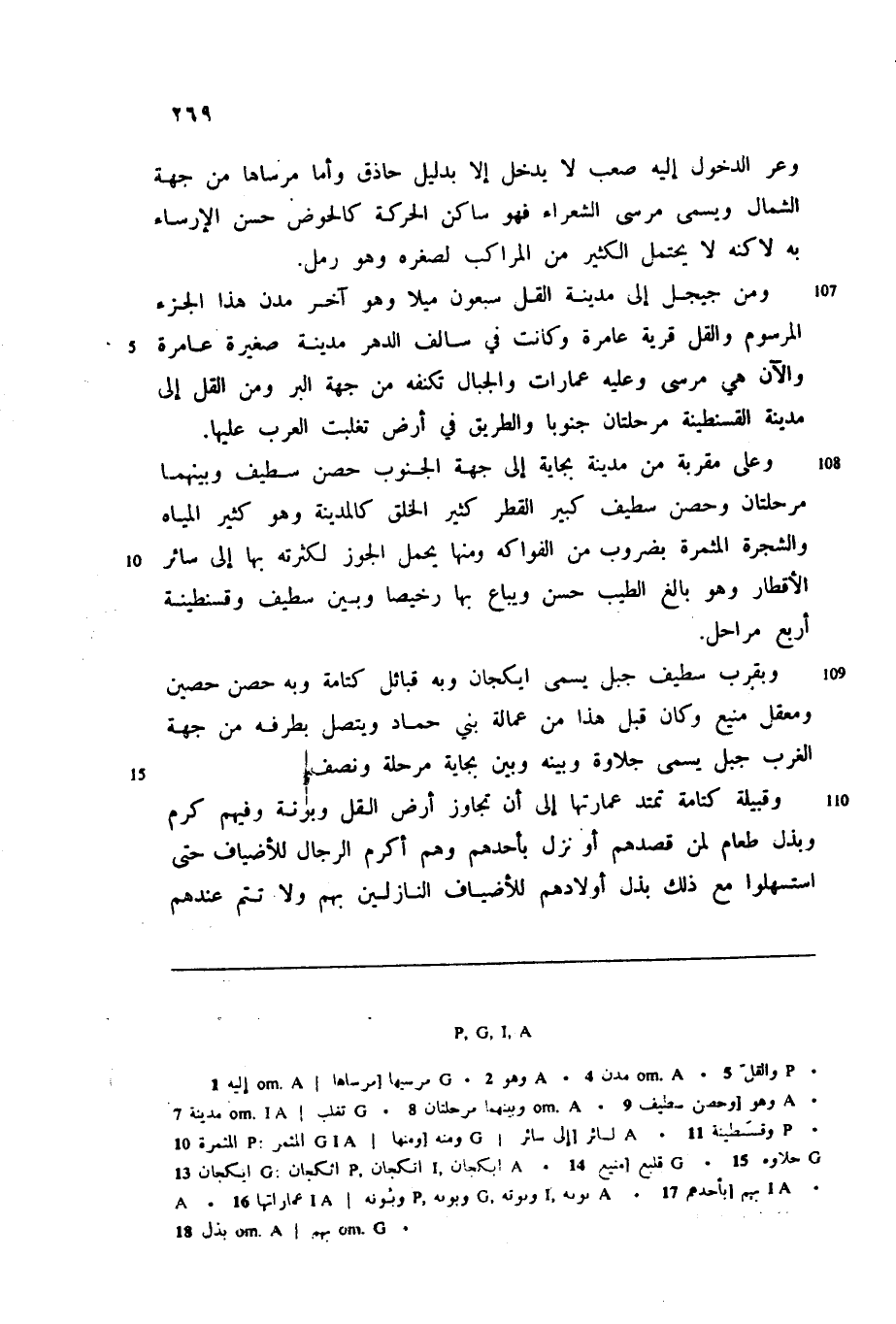 وعلى مقربة من مدينة بجاية إلى جهة الجنوب حصن سطيف وبينهما مرحلتان وحصن سطيف كبير القطر كثير الخلق كالمدينة وهو كثير المياه والشجرة المثمرة بضروب من الفواكه ومنها يحمل الجوز لكثرته بها إلى سائر الأقطار وهو بالغ الطيب حسن ويباع بها رخيصا وبين سطيف وقسنطينة أربع مراحل.
