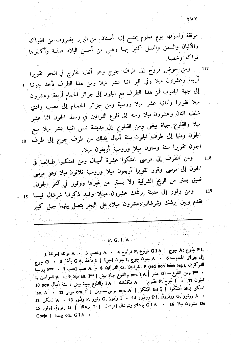 ومن حوض فروح إلى طرف جوج وهو أنف خارج في البحر تقويرا أربعة وعشرون ميلا وفي البر اثنا عشر ميلا ومن هذا الطرف تأخذ جونا إلى جهة الجنوب فمن هذا الطرف مع الجون إلى جزائر الحمام أربعة وعشرون ميلا تقويرا وثمانية عشر ميلا روسية ومن جزائر الحمام إلى مصب وادي شلف اثنان وعشرون ميلا ومنه إلى قلوع الفراتين في وسط الجون اثنا عشر ميلا والقلوع جباة بيض ومن القلوع إلى مدينة تنس اثنا عشر ميلا مع الجون ومنها إلى طرف الجون ستة أميال فذلك من طرف جوج إلى طرف الجون تقويرا ستة وستون ميلا وروسية أربعون ميلا.