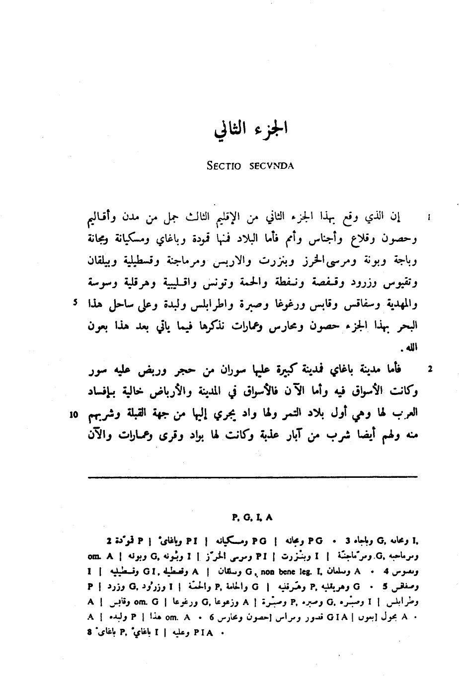 إن الذي وقع بهذا الجزء الثاني من الإقليم الثالث جمل من مدن وأقاليم وحصون وقلاع وأجناس وأمم فأما البلاد فمنها قمودة وباغاي ومسكيانة ومجانة وباجة وبونة ومرسى الخرز وبنزرت والاربس ومرماجنة وقسطيلية وبيلقان وتقيوس وزرود وقفصة ونفطة والحمة وتونس واقليبية وهرقلية وسوسة والمهدية وسفاقس وقابس ورغوغا وصبرة واطرابلس ولبدة وعلى ساحل هذا البحر بهذا الجزء حصون ومحارس وعمارات نذكرها فيما يأتي بعد هذا بعون الله.