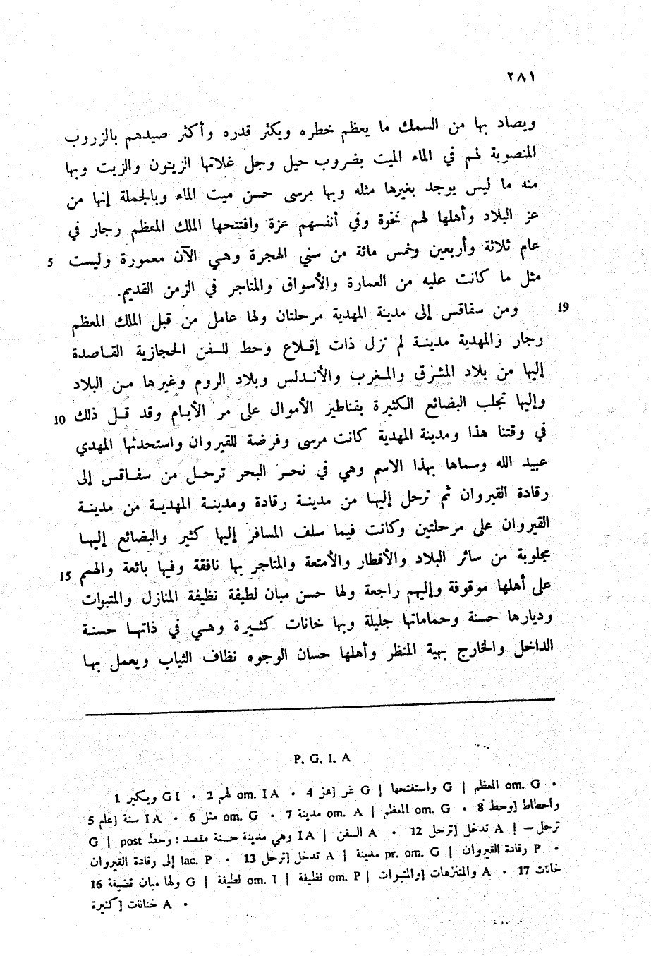 ومن سفاقس إلى مدينة المهدية مرحلتان ولها عامل من قبل الملك المعظم رجار والمهدية مدينة لم تزل ذات إقلاع وحط للسفن الحجازية القاصدة إليها من بلاد المشرق والمغرب والأندلس وبلاد الروم وغيرها من البلاد وإليها تجلب البضائع الكثيرة بقناطير الأموال على مر الأيام وقد قل ذلك في وقتنا هذا ومدينة المهدية كانت مرسى وفرضة للقيروان واستحدثها المهدي عبيد الله وسماها بهذا الاسم وهي في نحر البحر ترحل من سفاقس إلى رقادة القيروان ثم ترحل إليها من مدينة رقادة ومدينة المهدية من مدينة القيروان على مرحلتين وكانت فيما سلف المسافر إليها كثير والبضائع إليها مجلوبة من سائر البلاد والأقطار والأمتعة والمتاجر بها نافقة وفيها بائعة والهمم على أهلها موقوفة وإليهم راجعة ولها حسن مبان لطيفة نظيفة المنازل والمتبوات وديارها حسنة وحماماتها جليلة وبها خانات كثيرة وهي في ذاتها حسنة الداخل والخارج بهية المنظر وأهلها حسان الوجوه نظاف الثياب ويعمل بها