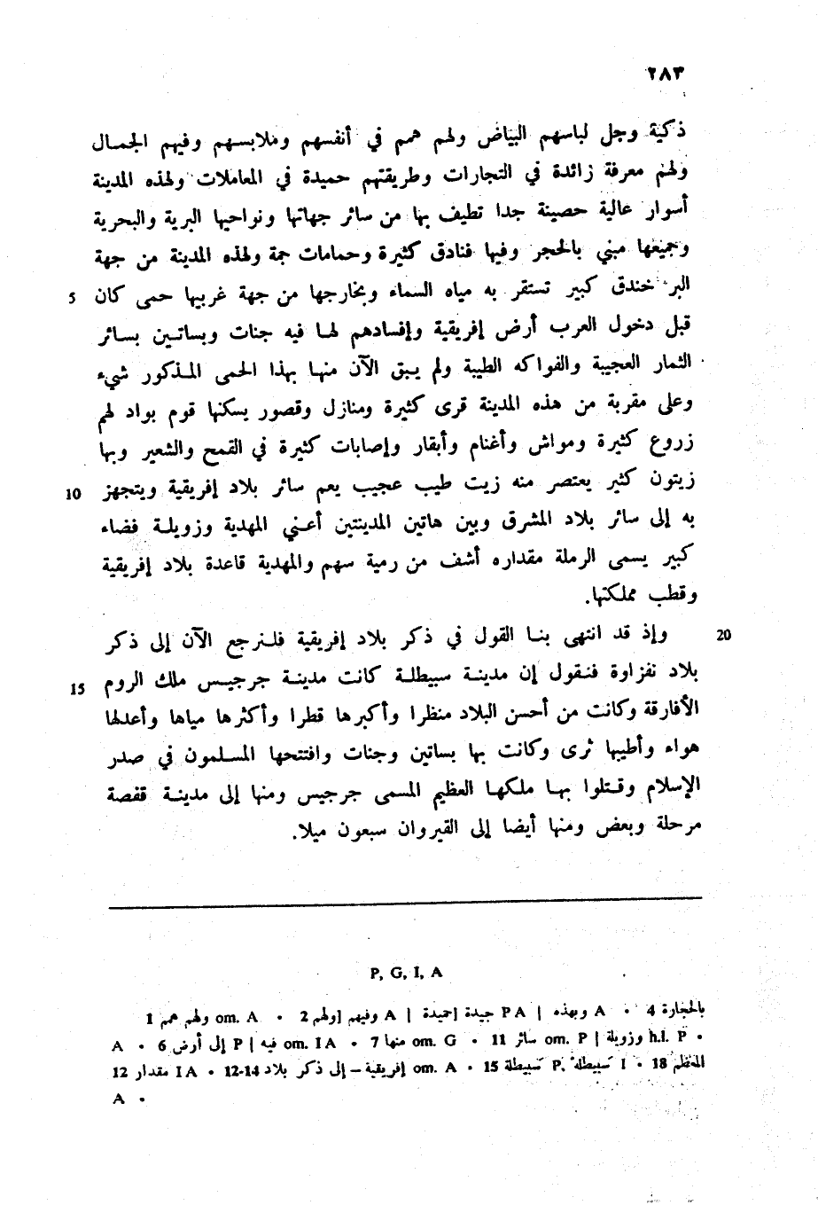 وإذ قد انتهى بنا القول في ذكر بلاد إفريقية فلنرجع الآن إلى ذكر بلاد نفزاوة فنقول إن مدينة سبيطلة كانت مدينة جرجيس ملك الروم الأفارقة وكانت من أحسن البلاد منظرا وأكبرها قطرا وأكثرها مياها وأعدلها هواء وأطيبها ثرى وكانت بها بساتين وجنات وافتتحها المسلمون في صدر الإسلام وقتلوا بها ملكها العظيم المسمى جرجيس ومنها إلى مدينة قفصة مرحلة وبعض ومنها أيضا إلى القيروان سبعون ميلا.