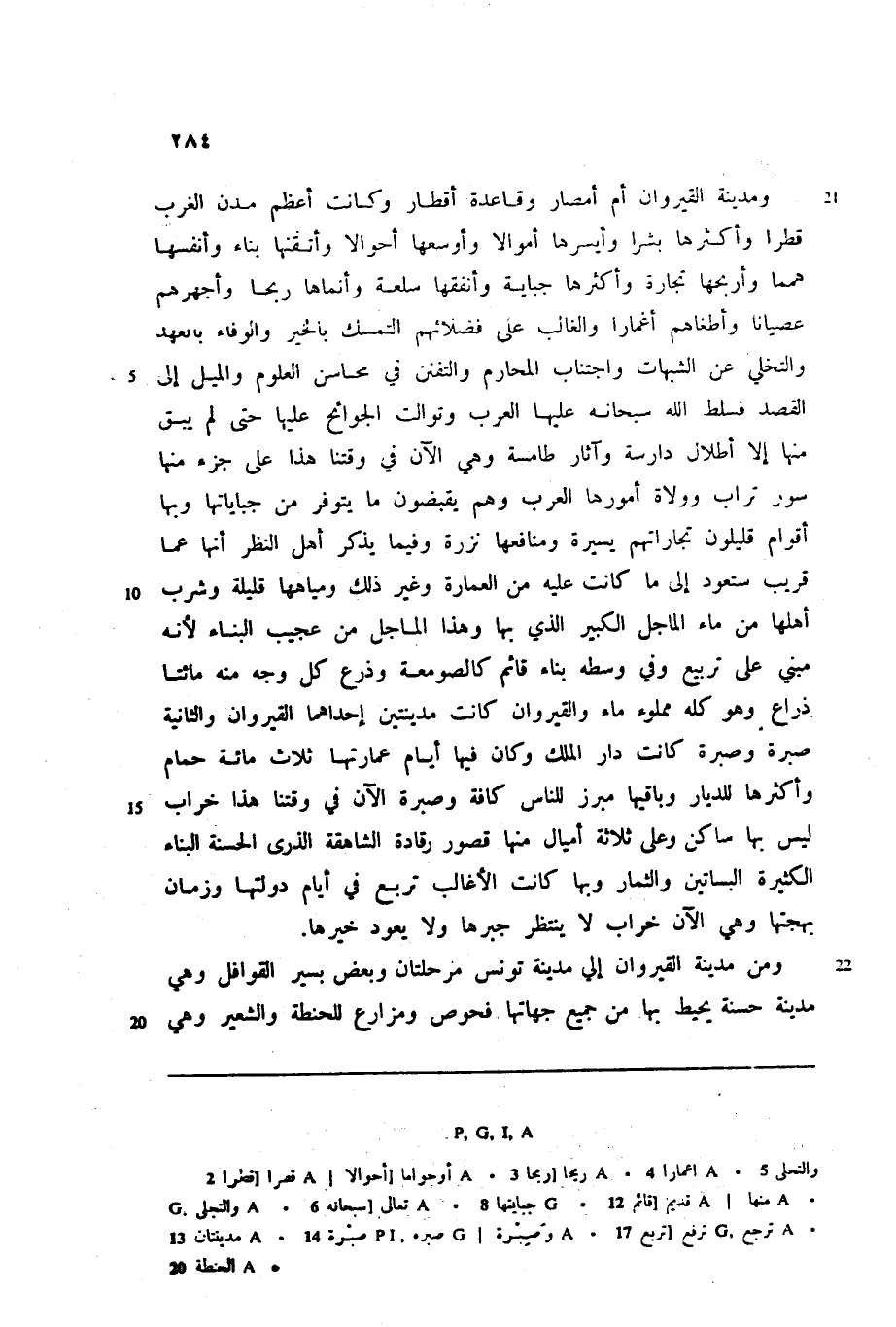 ومدينة القيروان أم أمصار وقاعدة أقطار وكانت أعظم مدن الغرب قطرا وأكثرها بشرا وأيسرها أموالا وأوسعها أحوالا وأتقنها بناء وأنفسها همما وأربحها تجارة وأكثرها جباية وأنفقها سلعة وأنماها ربحا وأجهرهم عصيانا وأطغاهم أغمارا والغالب على فضلائهم التمسك بالخير والوفاء بالعهد والتخلي عن الشبهات واجتناب المحارم والتفنن في محاسن العلوم والميل إلى القصد فسلط الله سبحانه عليها العرب وتوالت الجوائح عليها حتى لم يبق منها إلا أطلال دارسة وآثار طامسة وهي الآن في وقتنا هذا على جزء منها سور تراب وولاة أمورها العرب وهم يقبضون ما يتوفر من جباياتها وبها أقوام قليلون تجاراتهم يسيرة ومنافعها نزرة وفيما يذكر أهل النظر أنها عما قريب ستعود إلى ما كانت عليه من العمارة وغير ذلك ومياهها قليلة وشرب أهلها من ماء الماجل الكبير الذي بها وهذا الماجل من عجيب البناء لأنه مبني على تربيع وفي وسطه بناء قائم كالصومعة وذرع كل وجه منه مائتا ذراع وهو كله مملوء ماء والقيروان كانت مدينتين إحداهما القيروان والثانية صبرة وصبرة كانت دار الملك وكان فيها أيام عمارتها ثلاث مائة حمام وأكثرها للديار وباقيها مبرز للناس كافة وصبرة الآن في وقتنا هذا خراب ليس بها ساكن وعلى ثلاثة أميال منها قصور رقادة الشاهقة الذرى الحسنة البناء الكثيرة البساتين والثمار وبها كانت الأغالب تربع في أيام دولتها وزمان بهجتها وهي الآن خراب لا ينتظر جبرها ولا يعود خيرها.