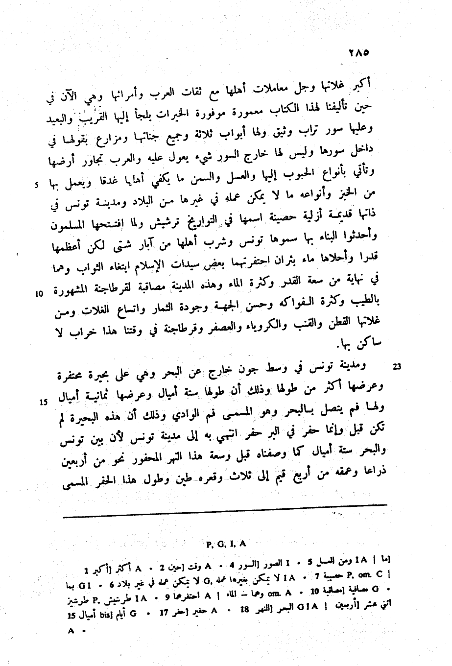 أكبر غلاتها وجل معاملات أهلها مع ثقات العرب وأمرائها وهي الآن في حين تأليفنا لهذا الكتاب معمورة موفورة الخيرات يلجأ إليها القريب والبعيد وعليها سور تراب وثيق ولها أبواب ثلاثة وجميع جناتها ومزارع بقولها في داخل سورها وليس لها خارج السور شيء يعول عليه والعرب تجاور أرضها وتأتي بأنواع الحبوب إليها والعسل والسمن ما يكفي أهلها غدقا ويعمل بها من الخبز وأنواعه ما لا يمكن عمله في غيرها من البلاد ومدينة تونس في ذاتها قديمة أزلية حصينة اسمها في التواريخ ترشيش ولما افتتحها المسلمون وأحدثوا البناء بها سموها تونس وشرب أهلها من آبار شتى لكن أعظمها قدرا وأحلاها ماء بئران احتفرتهما بعض سيدات الإسلام ابتغاء الثواب وهما في نهاية من سعة القدر وكثرة الماء وهذه المدينة مصاقبة لقرطاجنة المشهورة بالطيب وكثرة الفواكه وحسن الجهة وجودة الثمار واتساع الغلات ومن غلاتها القطن والقنب والكروياء والعصفر وقرطاجنة في وقتنا هذا خراب لا ساكن بها.