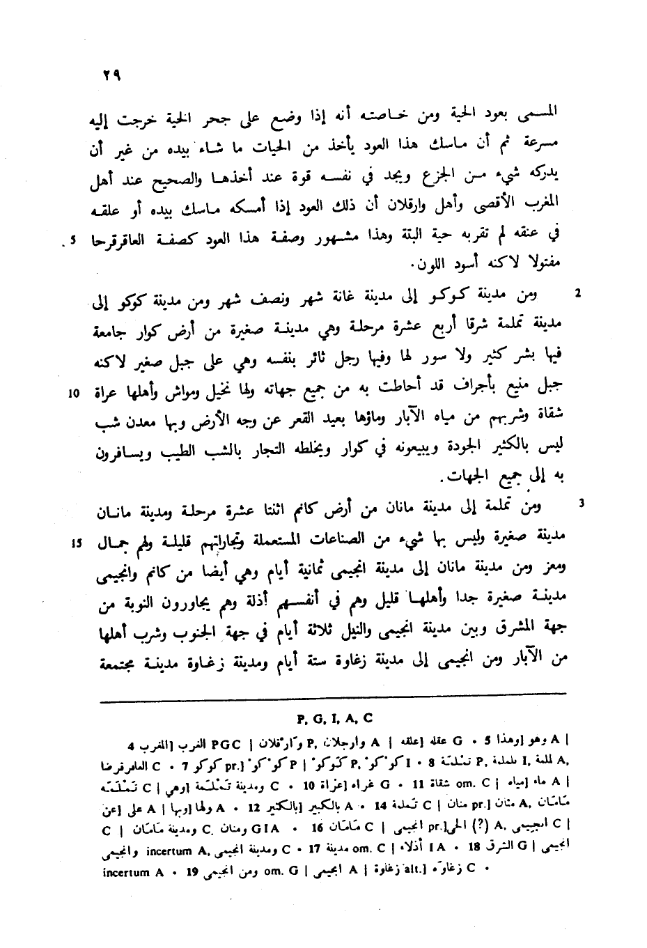 ومن تملمة إلى مدينة مانان من أرض كانم اثنتا عشرة مرحلة ومدينة مانان مدينة صغيرة وليس بها شيء من الصناعات المستعملة وتجاراتهم قليلة ولهم جمال ومعز ومن مدينة مانان إلى مدينة انجيمى ثمانية أيام وهي أيضا من كانم وانجيمى مدينة صغيرة جدا وأهلها قليل وهم في أنفسهم أذلة وهم يجاورون النوبة من جهة المشرق وبين مدينة انجيمى والنيل ثلاثة أيام في جهة الجنوب وشرب أهلها من الآبار ومن انجيمى إلى مدينة زغاوة ستة أيام ومدينة زغاوة مدينة مجتمعة