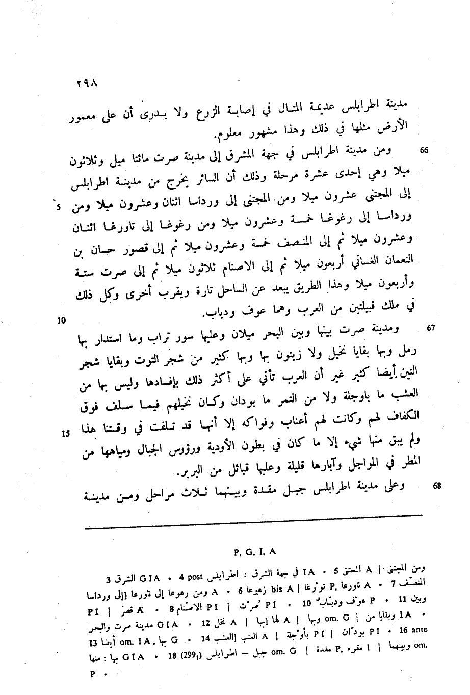 ومن مدينة اطرابلس في جهة المشرق إلى مدينة صرت مائتا ميل وثلاثون ميلا وهي إحدى عشرة مرحلة وذلك أن السائر يخرج من مدينة اطرابلس إلى المجتنى عشرون ميلا ومن المجتنى إلى ورداسا اثنان وعشرون ميلا ومن ورداسا إلى رغوغا خمسة وعشرون ميلا ومن رغوغا إلى تاورغا اثنان وعشرون ميلا ثم إلى المنصف خمسة وعشرون ميلا ثم إلى قصور حسان بن النعمان الغساني أربعون ميلا ثم إلى الاصنام ثلاثون ميلا ثم إلى صرت ستة وأربعون ميلا وهذا الطريق يبعد عن الساحل تارة ويقرب أخرى وكل ذلك في ملك قبيلتين من العرب وهما عوف ودباب.
