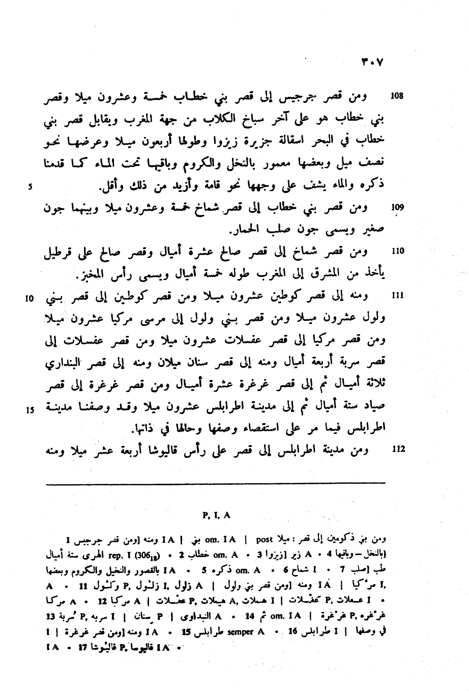 ومنه إلى قصر كوطين عشرون ميلا ومن قصر كوطين إلى قصر بني ولول عشرون ميلا ومن قصر بني ولول إلى مرسى مركيا عشرون ميلا ومن قصر مركيا إلى قصر عفسلات عشرون ميلا ومن قصر عفسلات إلى قصر سربة أربعة أميال ومنه إلى قصر سنان ميلان ومنه إلى قصر البنداري ثلاثة أميال ثم إلى قصر غرغرة عشرة أميال ومن قصر غرغرة إلى قصر صياد ستة أميال ثم إلى مدينة اطرابلس عشرون ميلا وقد وصفنا مدينة اطرابلس فيما مر على استقصاء وصفها وحالها في ذاتها.
