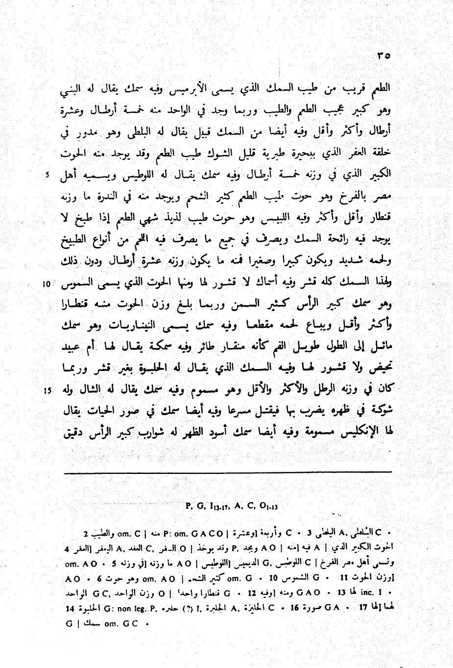 الطعم قريب من طيب السمك الذي يسمى الأبرميس وفيه سمك يقال له البني وهو كبير عجيب الطعم والطيب وربما وجد في الواحد منه خمسة أرطال وعشرة أرطال وأكثر وأقل وفيه أيضا من السمك قبيل يقال له البلطى وهو مدور في خلقة العفر الذي ببحيرة طبرية قليل الشوك طيب الطعم وقد يوجد منه الحوت الكبير الذي في وزنه خمسة أرطال وفيه سمك يقال له اللوطيس ويسميه أهل مصر بالفرخ وهو حوت طيب الطعم كثير الشحم ويوجد منه في الندرة ما وزنه قنطار وأقل وأكثر وفيه اللبيس وهو حوت طيب لذيذ شهي الطعم إذا طبخ لا يوجد فيه رائحة السمك ويصرف في جميع ما يصرف فيه اللحم من أنواع الطبيخ ولحمه شديد ويكون كبيرا وصغيرا فمنه ما يكون وزنه عشرة أرطال ودون ذلك ولهذا السمك كله قشر وفيه أسماك لا قشور لها ومنها الحوت الذي يسمى السموس وهو سمك كبير الرأس كثير السمن وربما بلغ وزن الحوت منه قنطارا وأكثر وأقل ويباع لحمه مقطعا وفيه سمك يسمى النيناريات وهو سمك مائل إلى الطول طويل الفم كأنه منقار طائر وفيه سمكة يقال لها أم عبيد تحيض ولا قشور لها وفيه السمك الذي يقال له الحلبوة بغير قشر وربما كان في وزنه الرطل والأكثر والأقل وهو مسموم وفيه سمك يقال له الشال وله شوكة في ظهره يضرب بها فيقتل مسرعا وفيه أيضا سمك في صور الحيات يقال لها الإنكليس مسمومة وفيه أيضا سمك أسود الظهر له شوارب كبير الرأس دقيق