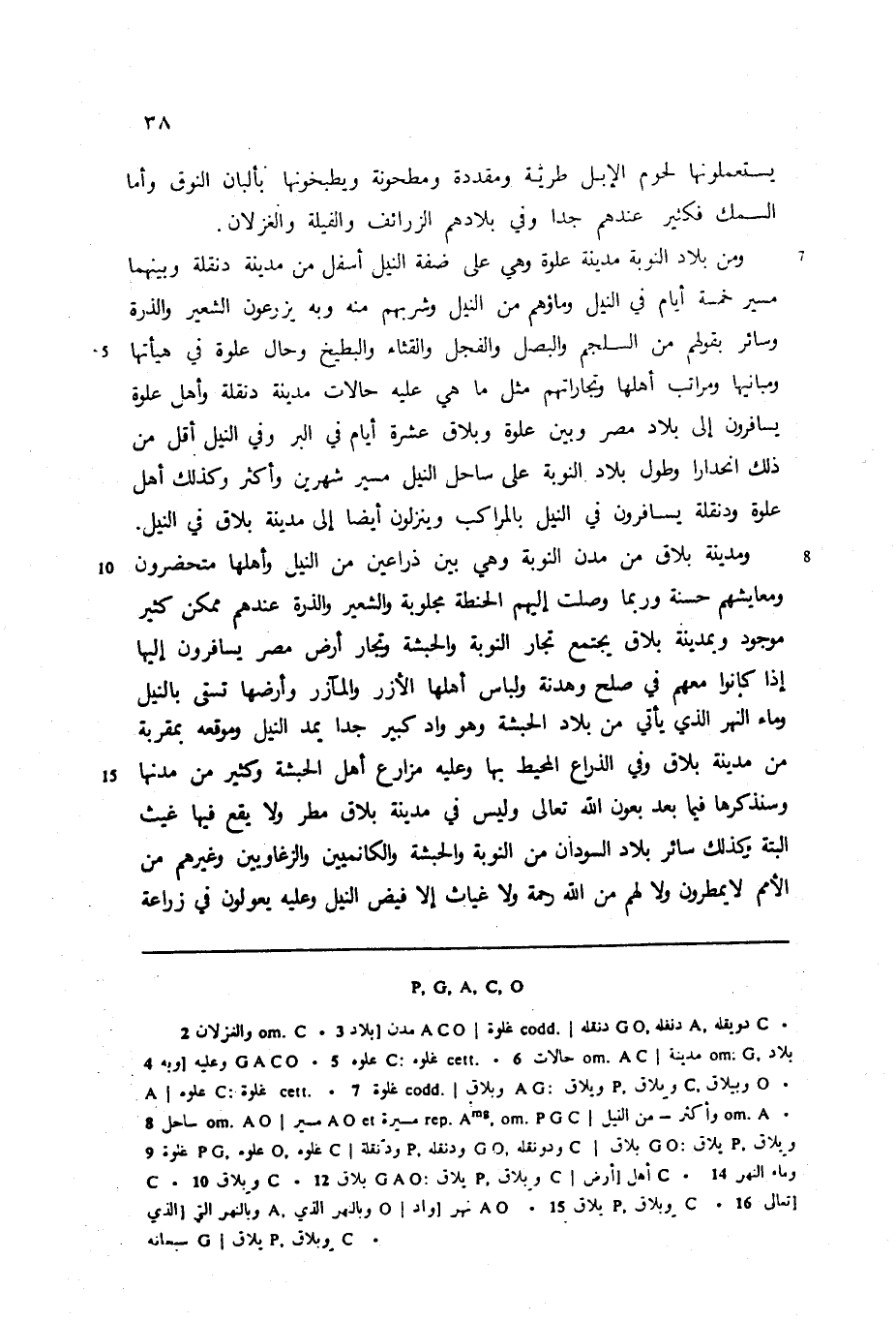 ومن بلاد النوبة مدينة علوة وهي على ضفة النيل أسفل من مدينة دنقلة وبينهما مسير خمسة أيام في النيل وماؤهم من النيل وشربهم منه وبه يزرعون الشعير والذرة وسائر بقولهم من السلجم والبصل والفجل والقثاء والبطيخ وحال علوة في هيأتها ومبانيها ومراتب أهلها وتجاراتهم مثل ما هي عليه حالات مدينة دنقلة وأهل علوة يسافرون إلى بلاد مصر وبين علوة وبلاق عشرة أيام في البر وفي النيل أقل من ذلك انحدارا وطول بلاد النوبة على ساحل النيل مسير شهرين وأكثر وكذلك أهل علوة ودنقلة يسافرون في النيل بالمراكب وينزلون أيضا إلى مدينة بلاق في النيل.