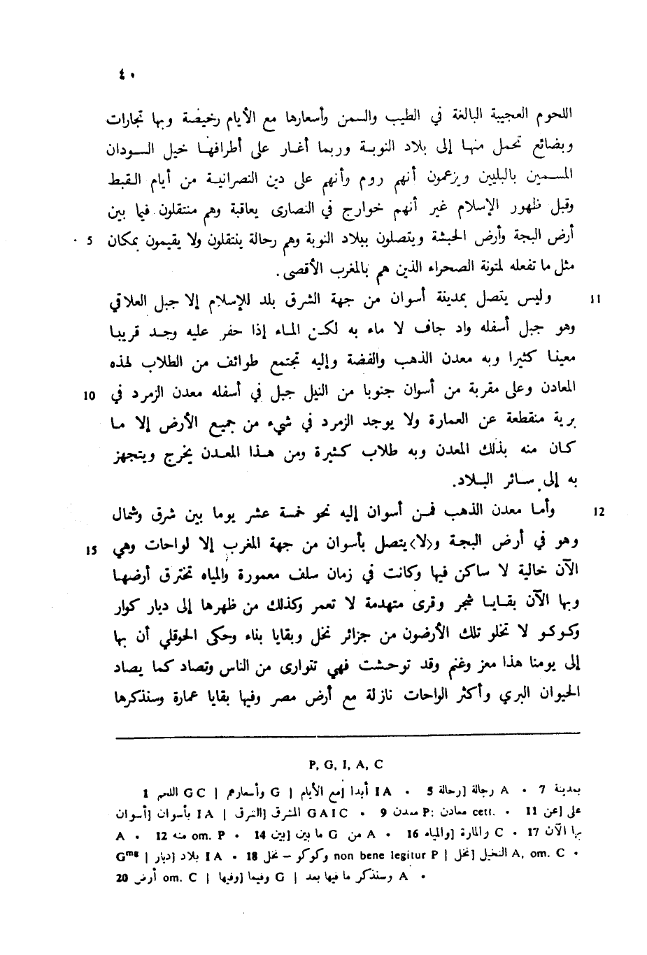 اللحوم العجيبة البالغة في الطيب والسمن وأسعارها مع الأيام رخيصة وبها تجارات وبضائع تحمل منها إلى بلاد النوبة وربما أغار على أطرافها خيل السودان المسمين بالبليين ويزعمون أنهم روم وأنهم على دين النصرانية من أيام القبط وقبل ظهور الإسلام غير أنهم خوارج في النصارى يعاقبة وهم منتقلون فيما بين أرض البجة وأرض الحبشة ويتصلون ببلاد النوبة وهم رحالة ينتقلون ولا يقيمون بمكان مثل ما تفعله لمتونة الصحراء الذين هم بالمغرب الأقصى.