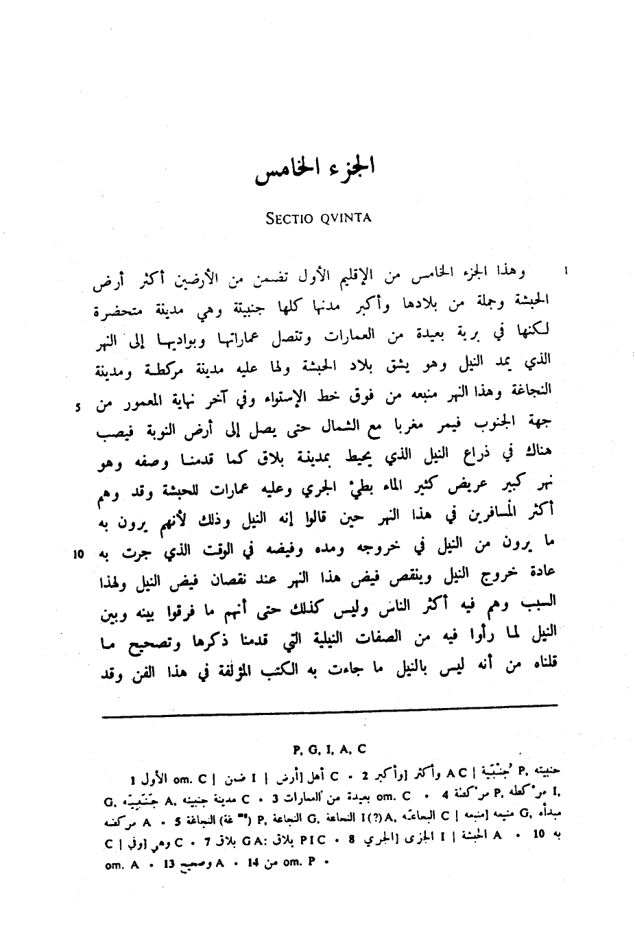 وهذا الجزء الخامس من الإقليم الأول تضمن من الأرضين أكثر أرض الحبشة وجملة من بلادها وأكبر مدنها كلها جنبيتة وهي مدينة متحضرة لكنها في برية بعيدة من العمارات وتتصل عماراتها وبواديها إلى النهر الذي يمد النيل وهو يشق بلاد الحبشة ولها عليه مدينة مركطة ومدينة النجاغة وهذا النهر منبعه من فوق خط الاستواء وفي آخر نهاية المعمور من جهة الجنوب فيمر مغربا مع الشمال حتى يصل إلى أرض النوبة فيصب هناك في ذراع النيل الذي يحيط بمدينة بلاق كما قدمنا وصفه وهو نهر كبير عريض كثير الماء بطيء الجري وعليه عمارات للحبشة وقد وهم أكثر المسافرين في هذا النهر حين قالوا إنه النيل وذلك لأنهم يرون به ما يرون من النيل في خروجه ومده وفيضه في الوقت الذي جرت به عادة خروج النيل وينقص فيض هذا النهر عند نقصان فيض النيل ولهذا السبب وهم فيه أكثر الناس وليس كذلك حتى أنهم ما فرقوا بينه وبين النيل لما رأوا فيه من الصفات النيلية التي قدمنا ذكرها وتصحيح ما قلناه من أنه ليس بالنيل ما جاءت به الكتب المؤلفة في هذا الفن وقد