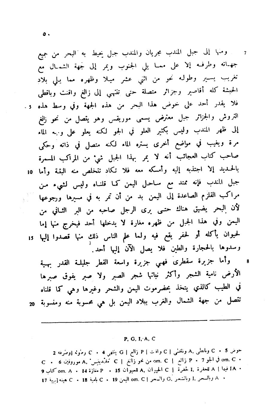 وأما جزيرة سقطرى فهي جزيرة واسعة القطر جليلة القدر بهية الأرض نامية الشجر وأكثر نباتها شجر الصبر ولا صبر يفوق صبرها في الطيب كالذي يتخذ بحضرموت اليمن والشحر وغيرها وهي كما قلناه تتصل من جهة الشمال والغرب ببلاد اليمن بل هي محسوبة منه ومنسوبة