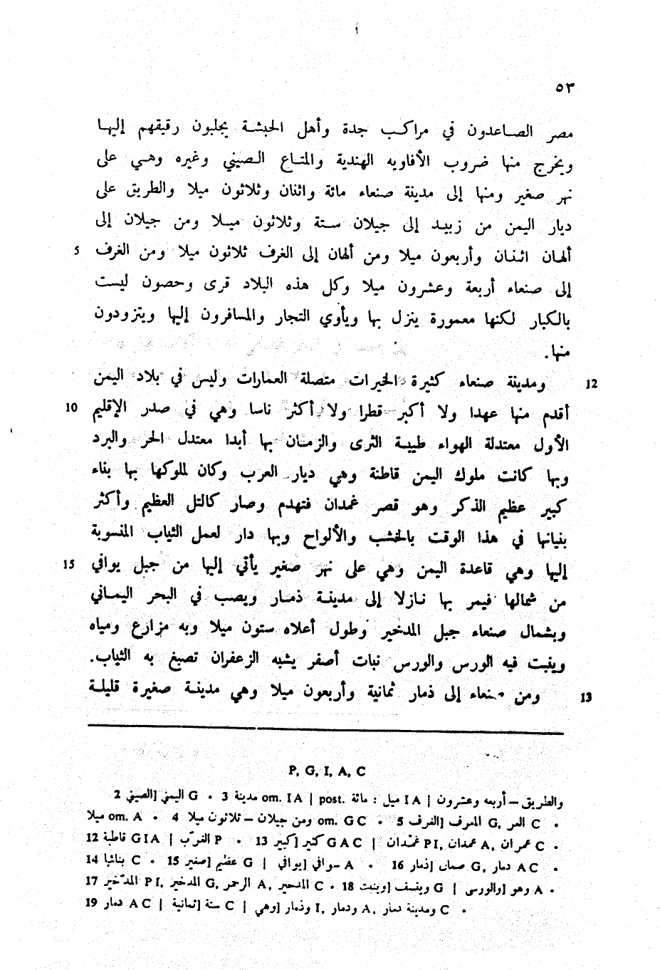 مصر الصاعدون في مراكب جدة وأهل الحبشة يجلبون رقيقهم إليها ويخرج منها ضروب الأفاويه الهندية والمتاع الصيني وغيره وهي على نهر صغير ومنها إلى مدينة صنعاء مائة واثنان وثلاثون ميلا والطريق على ديار اليمن من زبيد إلى جيلان ستة وثلاثون ميلا ومن جيلان إلى ألهان اثنان وأربعون ميلا ومن ألهان إلى الغرف ثلاثون ميلا ومن الغرف إلى صنعاء أربعة وعشرون ميلا وكل هذه البلاد قرى وحصون ليست بالكبار لكنها معمورة ينزل بها ويأوي التجار والمسافرون إليها ويتزودون منها.