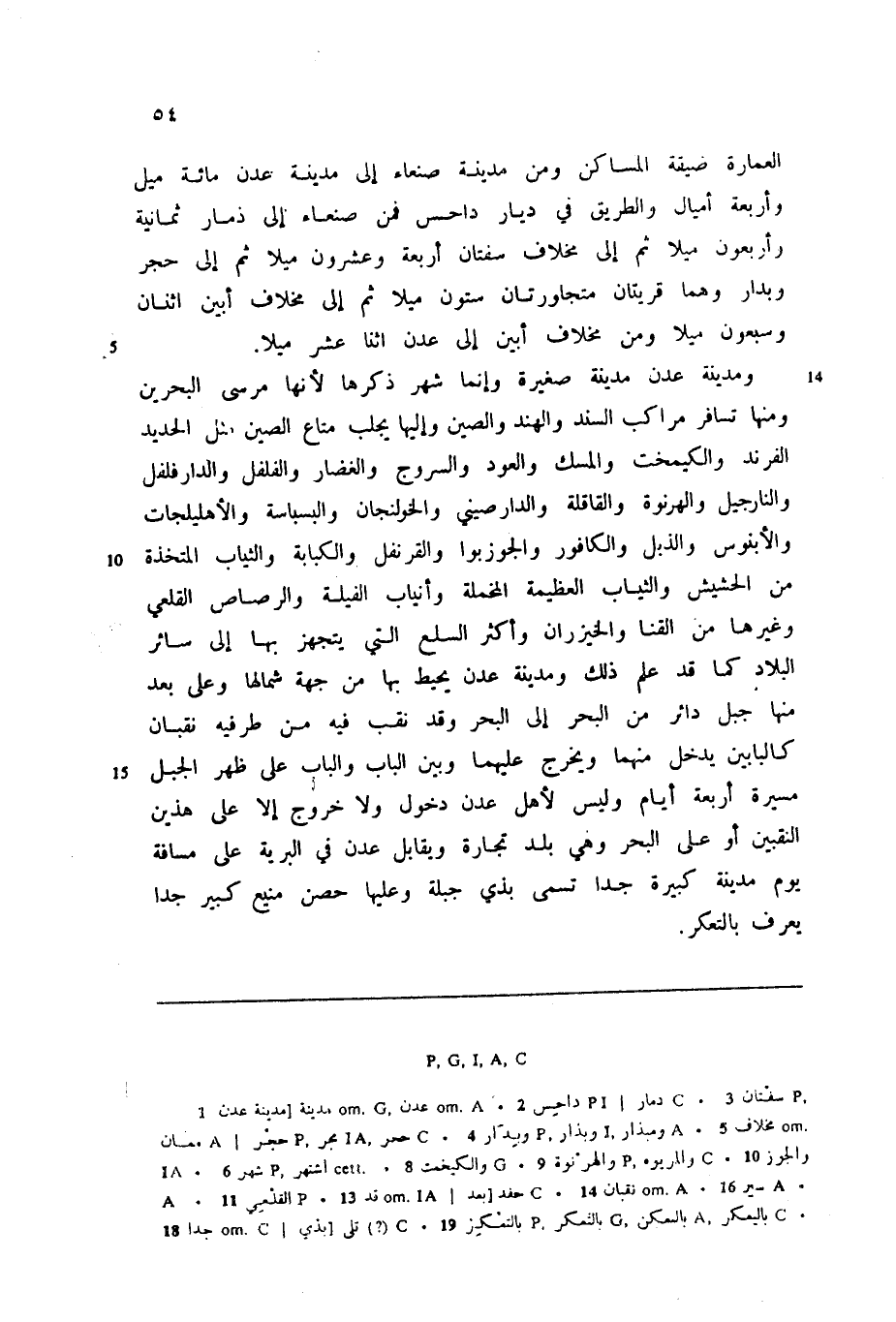 ومدينة عدن مدينة صغيرة وإنما شهر ذكرها لأنها مرسى البحرين ومنها تسافر مراكب السند والهند والصين وإليها يجلب متاع الصين مثل الحديد الفرند والكيمخت والمسك والعود والسروج والغضار والفلفل والدار فلفل والنارجيل والهرنوة والقاقلة والدارصيني والخولنجان والبسباسة والإهليلجات والأبنوس والذبل والكافور والجوزبوا والقرنفل والكبابة والثياب المتخذة من الحشيش والثياب العظيمة المخملة وأنياب الفيلة والرصاص القلعي وغيرها من القنا والخيزران وأكثر السلع التي يتجهز بها إلى سائر البلاد كما قد علم ذلك ومدينة عدن يحيط بها من جهة شمالها وعلى بعد منها جبل دائر من البحر إلى البحر وقد نقب فيه من طرفيه نقبان كالبابين يدخل منهما ويخرج عليهما وبين الباب والباب على ظهر الجبل مسيرة أربعة أيام وليس لأهل عدن دخول ولا خروج إلا على هذين النقبين أو على البحر وهي بلد تجارة ويقابل عدن في البرية على مسافة يوم مدينة كبيرة جدا تسمى بذي جبلة وعليها حصن منيع كبير جدا يعرف بالتعكر.