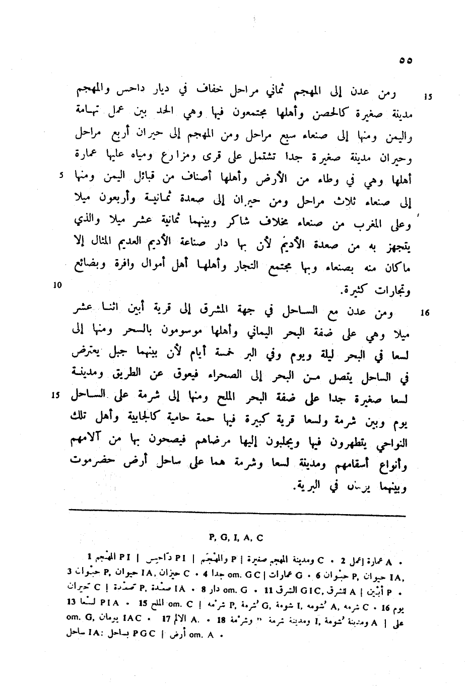 ومن عدن مع الساحل في جهة المشرق إلى قرية أبين اثنا عشر ميلا وهي على ضفة البحر اليماني وأهلها موسومون بالسحر ومنها إلى لسعا في البحر ليلة ويوم وفي البر خمسة أيام لأن بينهما جبل يعترض في الساحل يتصل من البحر إلى الصحراء فيعوق عن الطريق ومدينة لسعا صغيرة جدا على ضفة البحر الملح ومنها إلى شرمة على الساحل يوم وبين شرمة ولسعا قرية كبيرة فيها حمة حامية كالجابية وأهل تلك النواحي يتطهرون فيها ويجلبون إليها مرضاهم فيصحون بها من آلامهم وأنواع أسقامهم ومدينة لسعا وشرمة هما على ساحل أرض حضرموت وبينهما يومان في البرية.