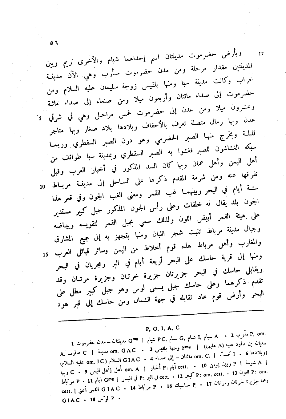 وبأرض حضرموت مدينتان اسم إحداهما شبام والأخرى تريم وبين المدينتين مقدار مرحلة ومن مدن حضرموت مأرب وهي الآن مدينة خراب وكانت مدينة سبا ومنها بلقيس زوجة سليمان عليه السلام ومن حضرموت إلى صداء مائتان وأربعون ميلا ومن صنعاء إلى صداء مائة وعشرون ميلا ومن عدن إلى حضرموت خمس مراحل وهي في شرقي عدن وبها رمال متصلة تعرف بالأحقاف وبلادها بلاد صغار وبها متاجر قليلة ويخرج منها الصبر الحضرمي وهو دون الصبر السقطري وربما سبكه الغشاشون للصبر فغشوا به الصبر السقطري وبمدينة سبا طوائف من أهل اليمن وأهل عمان وبها كان السد المذكور في أخبار العرب وقبل تفرقها عنه ومن شرمة المقدم ذكرها على الساحل إلى مدينة مرباط ستة أيام في البحر وبينهما غب القمر ومعنى الغب الجون وفي قعر هذا الجون بلد يقال له خلفات وعلى رأس الجون المذكور جبل كبير مستدير على هيئة القمر أبيض اللون ولذلك سمي بجبل القمر لتقويسه وبياضه وجبال مدينة مرباط تنبت شجر اللبان ومنها يتجهز به إلى جميع المشارق والمغارب وأهل مرباط هذه قوم أخلاط من اليمن وسائر قبائل العرب ومنها إلى قرية حاسك على البحر أربعة أيام في البر ومجريان في البحر ويقابل حاسك في البحر جزيرتان جزيرة خرتان وجزيرة مرتان وقد تقدم ذكرهما وعلى حاسك جبل يسمى لوس وهو جبل كبير مطل على البحر وأرض قوم عاد تقابله في جهة الشمال ومن حاسك إلى قبر هود