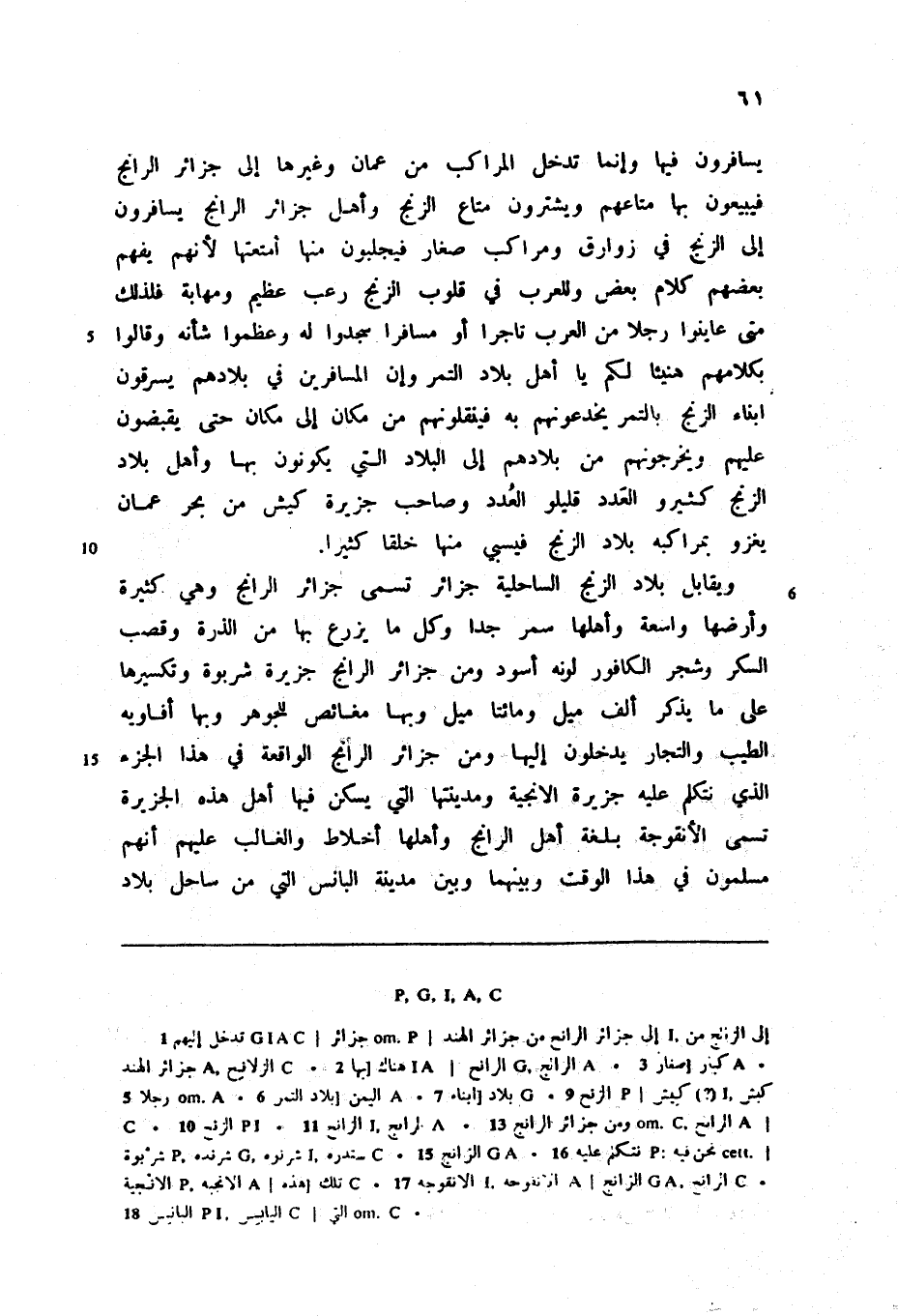 يسافرون فيها وإنما تدخل المراكب من عمان وغيرها إلى جزائر الرانج فيبيعون بها متاعهم ويشترون متاع الزنج وأهل جزائر الرانج يسافرون إلى الزنج في زوارق ومراكب صغار فيجلبون منها أمتعتها لأنهم يفهم بعضهم كلام بعض وللعرب في قلوب الزنج رعب عظيم ومهابة فلذلك متى عاينوا رجلا من العرب تاجرا أو مسافرا سجدوا له وعظموا شأنه وقالوا بكلامهم هنيئا لكم يا أهل بلاد التمر وإن المسافرين في بلادهم يسرقون ابناء الزنج بالتمر يخدعونهم به فينقلونهم من مكان إلى مكان حتى يقبضون عليهم ويخرجونهم من بلادهم إلى البلاد التي يكونون بها وأهل بلاد الزنج كثيرو العدد قليلو العدد وصاحب جزيرة كيش من بحر عمان يغزو بمراكبه بلاد الزنج فيسبي منها خلقا كثيرا.