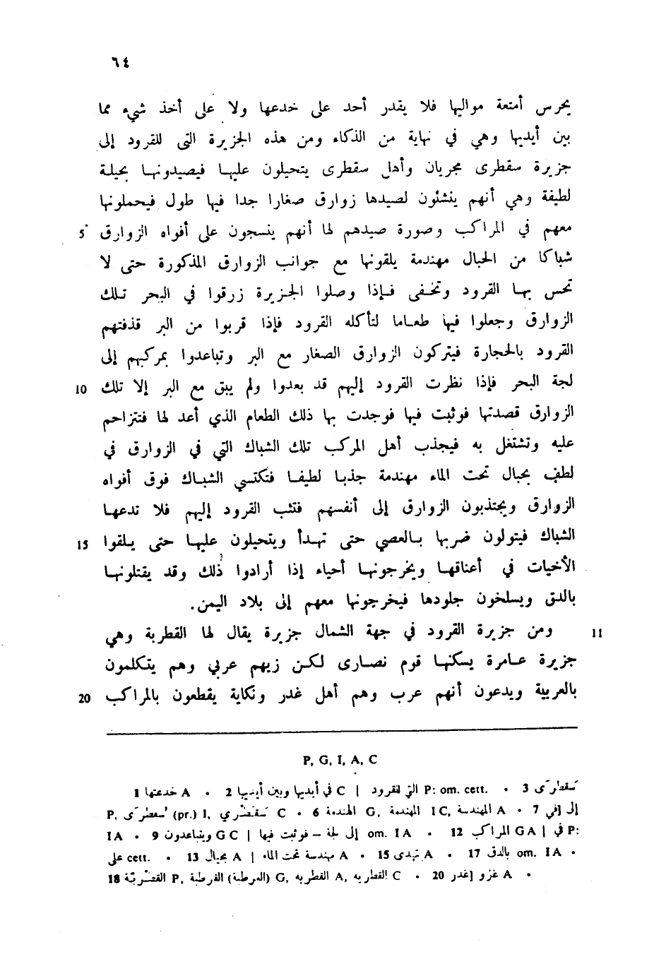 ومن جزيرة القرود في جهة الشمال جزيرة يقال لها القطربة وهي جزيرة عامرة يسكنها قوم نصارى لكن زيهم عربي وهم يتكلمون بالعربية ويدعون أنهم عرب وهم أهل غدر ونكاية يقطعون بالمراكب