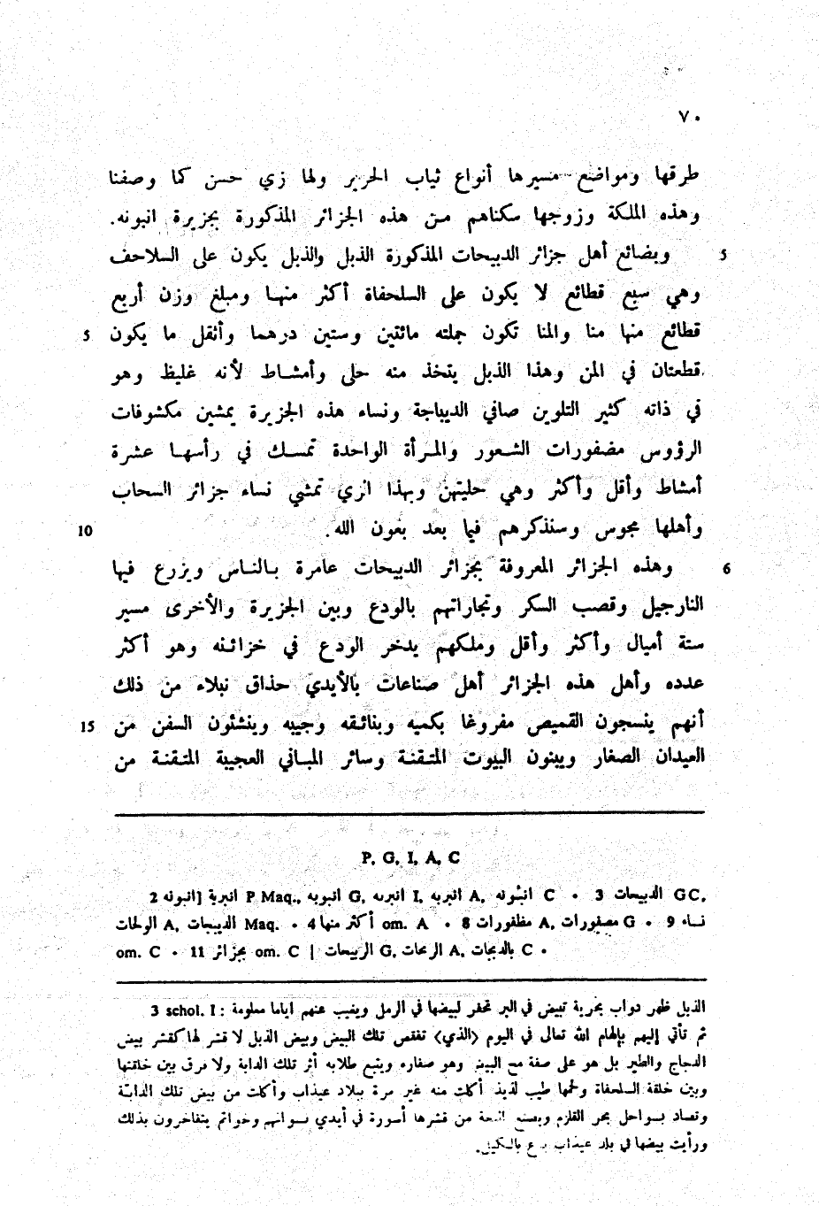 وبضائع أهل جزائر الدبيحات المذكورة الذبل والذبل يكون على السلاحف وهي سبع قطائع لا يكون على السلحفاة أكثر منها ومبلغ وزن أربع قطائع منها منا والمنا تكون جملته مائتين وستين درهما وأثقل ما يكون قطعتان في المن وهذا الذبل يتخذ منه حلى وأمشاط لأنه غليظ وهو في ذاته كثير التلوين صافي الديباجة ونساء هذه الجزيرة يمشين مكشوفات الرءوس مضفورات الشعور والمرأة الواحدة تمسك في رأسها عشرة أمشاط وأقل وأكثر وهي حليتهن وبهذا الزي تمشي نساء جزائر السحاب وأهلها مجوس وسنذكرهم فيما بعد بعون الله.
