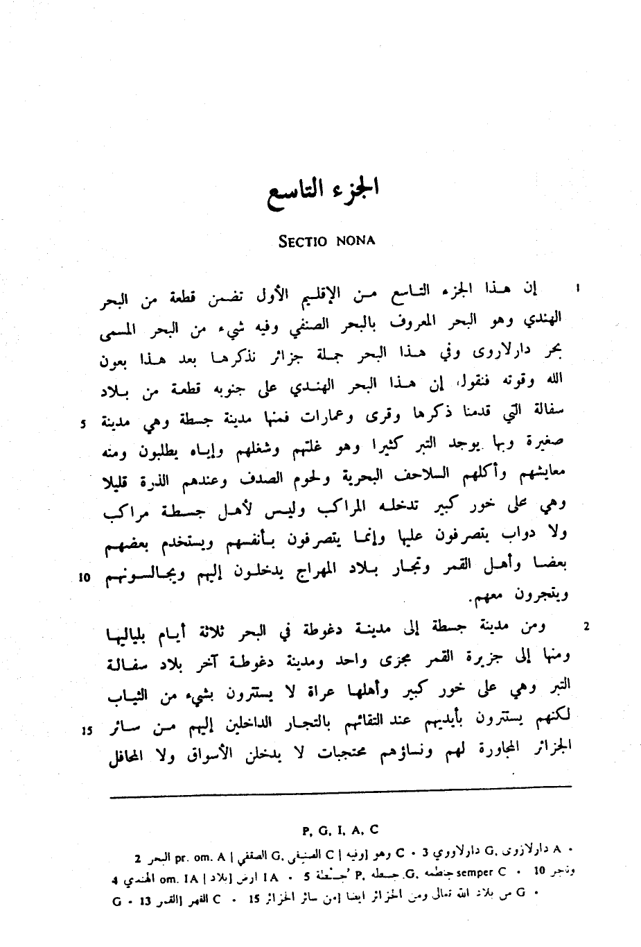إن هذا الجزء التاسع من الإقليم الأول تضمن قطعة من البحر الهندي وهو البحر المعروف بالبحر الصنفي وفيه شيء من البحر المسمى بحر دارلاروى وفي هذا البحر جملة جزائر نذكرها بعد هذا بعون الله وقوته فنقول إن هذا البحر الهندي على جنوبه قطعة من بلاد سفالة التي قدمنا ذكرها وقرى وعمارات فمنها مدينة جسطة وهي مدينة صغيرة وبها يوجد التبر كثيرا وهو غلتهم وشغلهم وإياه يطلبون ومنه معايشهم وأكلهم السلاحف البحرية ولحوم الصدف وعندهم الذرة قليلا وهي على خور كبير تدخله المراكب وليس لأهل جسطة مراكب ولا دواب يتصرفون عليها وإنما يتصرفون بأنفسهم ويستخدم بعضهم بعضا وأهل القمر وتجار بلاد المهراج يدخلون إليهم ويجالسونهم ويتجرون معهم.