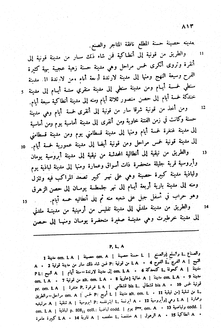 والطريق من نيقية إلى أنطالية المحدثة من نيقية إلى مدينة أبروسية يومان وأبروسية قرية جليلة متحضرة ذات أسواق وعمارة ومنها إلى مدينة لباذية يوم ولباذية مدينة كبيرة حصينة وهي على نهر كبير تصعد المراكب فيه وتنزل ومنه إلى مدينة بارية أربعة أيام إلى نهر جلمطسة يومان إلى حصن الزهرق وهو خراب في أسفل جبل على شعبة منه ثم إلى أنطالية خمسة أيام.