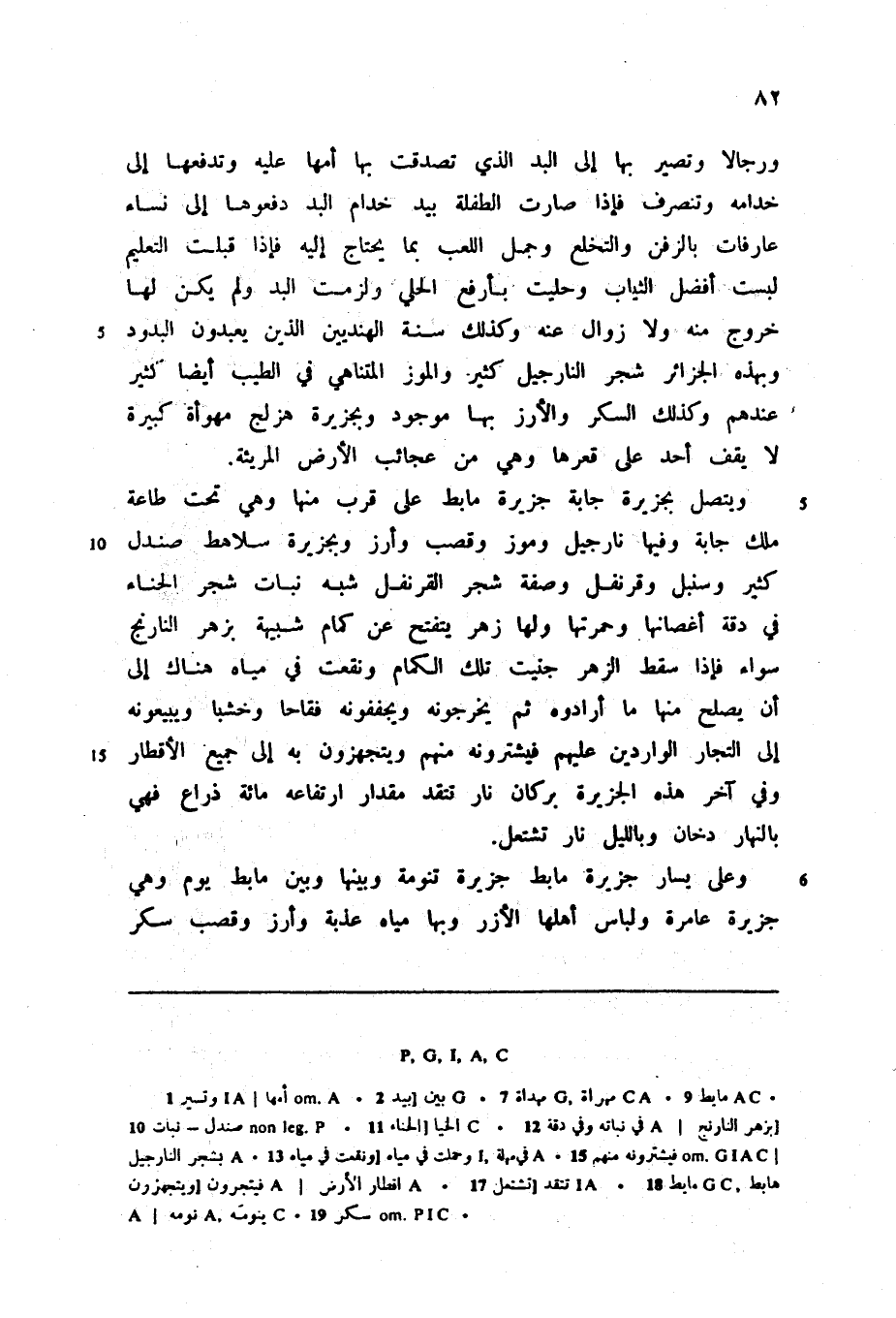 ورجالا وتصير بها إلى البد الذي تصدقت بها أمها عليه وتدفعها إلى خدامه وتنصرف فإذا صارت الطفلة بيد خدام البد دفعوها إلى نساء عازفات بالزفن والتخلع وجمل اللعب بما يحتاج إليه فإذا قبلت التعليم لبست أفضل الثياب وحليت بأرفع الحلي ولزمت البد ولم يكن لها خروج منه ولا زوال عنه وكذلك سنة الهنديين الذين يعبدون البدود وبهذه الجزائر شجر النارجيل كثير والموز المتناهي في الطيب أيضا كثير عندهم وكذلك السكر والأرز بها موجود وبجزيرة هزلج مهوأة كبيرة لا يقف أحد على قعرها وهي من عجائب الأرض المريئة.