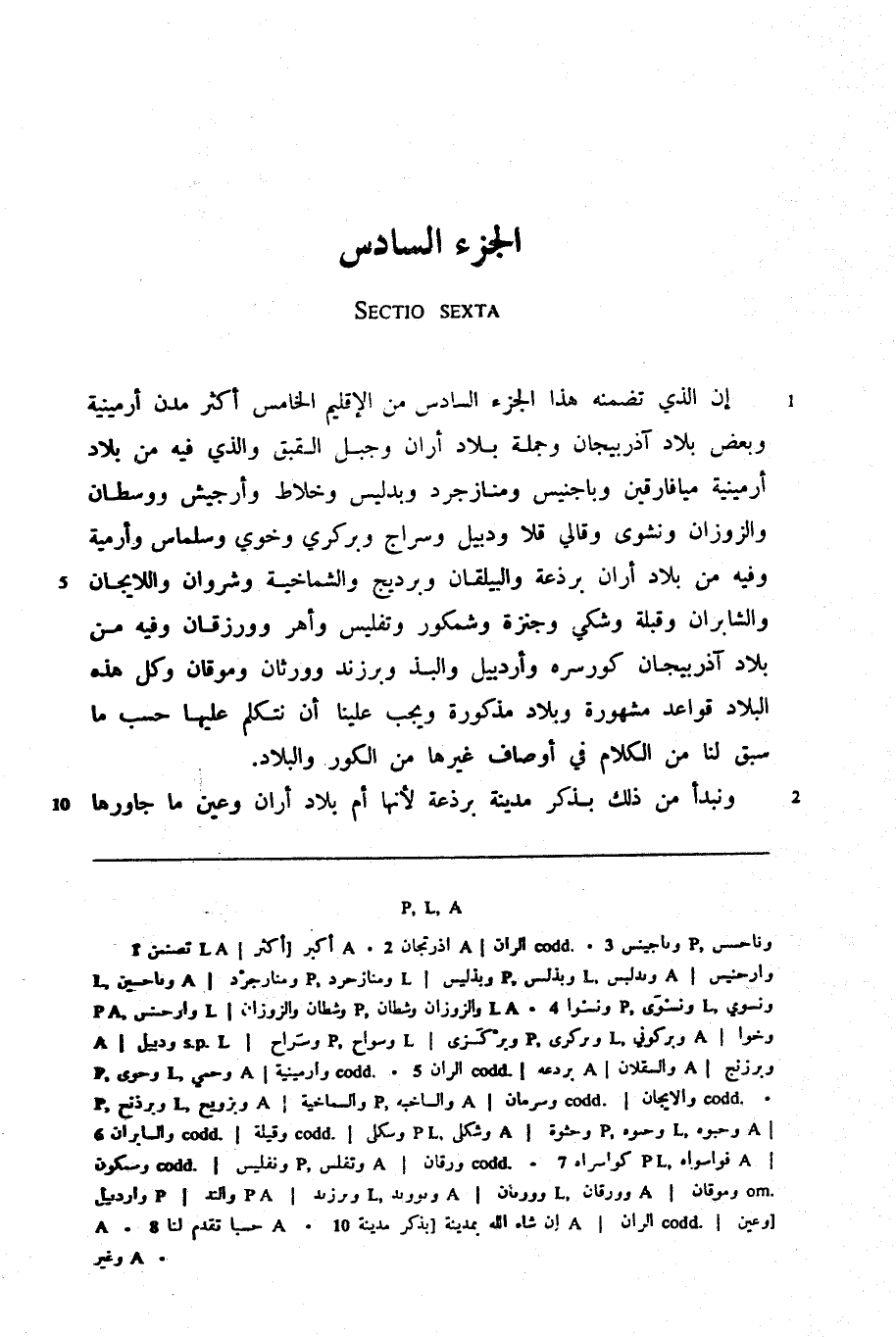 إن الذي تضمنه هذا الجزء السادس من الإقليم الخامس أكثر مدن أرمينية وبعض بلاد آذربيجان وجملة بلاد أران وجبل القبق والذي فيه من بلاد أرمينية ميافارقين وباجنيس ومنازجرد وبدليس وخلاط وأرجيش ووسطان والزوزان ونشوى وقالي قلا ودبيل وسراج وبركري وخوي وسلماس وأرمية وفيه من بلاد أران برذعة والبيلقان وبرديج والشماخية وشروان واللايجان والشابران وقبلة وشكي وجنزة وشمكور وتفليس وأهر وورزقان وفيه من بلاد آذربيجان كورسره وأردبيل والبذ وبرزند وورثان وموقان وكل هذه البلاد قواعد مشهورة وبلاد مذكورة ويجب علينا أن نتكلم عليها حسب ما سبق لنا من الكلام في أوصاف غيرها من الكور والبلاد.