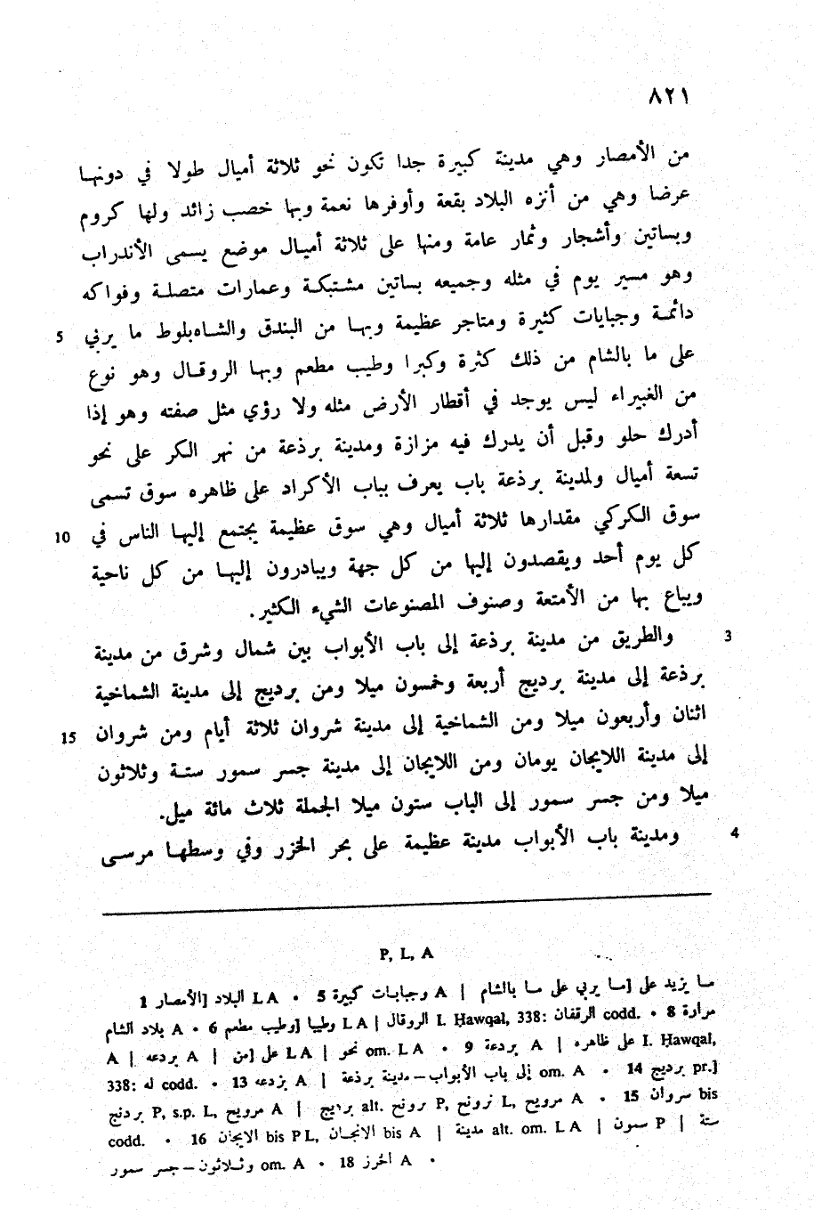 والطريق من مدينة برذعة إلى باب الأبواب بين شمال وشرق من مدينة برذعة إلى مدينة برديج أربعة وخمسون ميلا ومن برديج إلى مدينة الشماخية اثنان وأربعون ميلا ومن الشماخية إلى مدينة شروان ثلاثة أيام ومن شروان إلى مدينة اللايجان يومان ومن اللايجان إلى مدينة جسر سمور ستة وثلاثون ميلا ومن جسر سمور إلى الباب ستون ميلا الجملة ثلاث مائة ميل.