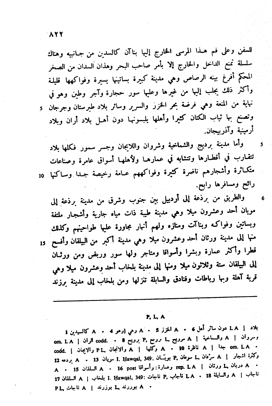 والطريق من برذعة إلى أردبيل بين جنوب وشرق من مدينة برذعة إلى مويان أحد وعشرون ميلا وهي مدينة طيبة ذات مياه جارية وأشجار ملتفة وبساتين وفواكه وبنا آت ومنازه ولهم أنهار مجاورة عليها طواحينهم وكذلك منها إلى مدينة ورثان أحد وعشرون ميلا وهي مدينة أكبر من البيلقان وأفسح قطرا وأكثر عمارة وبشرا وأسواقا ومتاجر ولها سور وربض ومن ورثان إلى البيلقان ستة وثلاثون ميلا ومنها إلى مدينة بلخاب أحد وعشرون ميلا وهي قرية آهلة وبها رباطات وفنادق والسابلة تنزلها ومن بلخاب إلى مدينة برزند