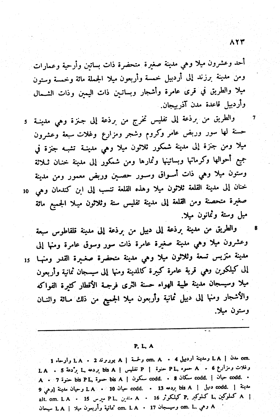 والطريق من برذعة إلى تفليس تخرج من برذعة إلى جنزة وهي مدينة حسنة لها سور وربض عامر وكروم وشجر ومزارع وغلات سبعة وعشرون ميلا ومن جنزة إلى مدينة شمكور ثلاثون ميلا وهي مدينة تشبه جنزة في جميع أحوالها وكرماتها وبساتينها وثمارها ومن شمكور إلى مدينة خنان ثلاثة وستون ميلا وهي ذات أسواق وسور حصين وربض معمور ومن مدينة خنان إلى مدينة القلعة ثلاثون ميلا وهذه القلعة تنسب إلى ابن كندمان وهي صغيرة متحصنة ومن القلعة إلى مدينة تفليس ستة وثلاثون ميلا الجميع مائة ميل وستة وثمانون ميلا.